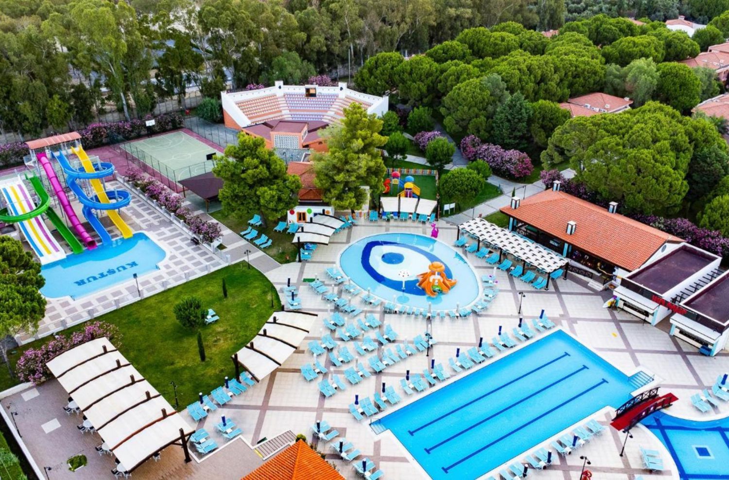 Намира се на 70 км от летище Измир, на 130 км от летище Милас, на 4 км от центъра на Кушадасъ, на 50 м от брега на морето. Построен през 1998 г., поетапно разширяван в периода 2004-2008 г., с обща площ 170 000 м², където тюркоазено синьото на Егейско море се слива с огромна гора от борови дървета с красиви цветя. BUNGALOW GARDEN ROOMS са реновирани през 2014 г., SUPERIOR ROOMS са реновирани през 2021 г. , FAMILY ROOMS през 2022 г.