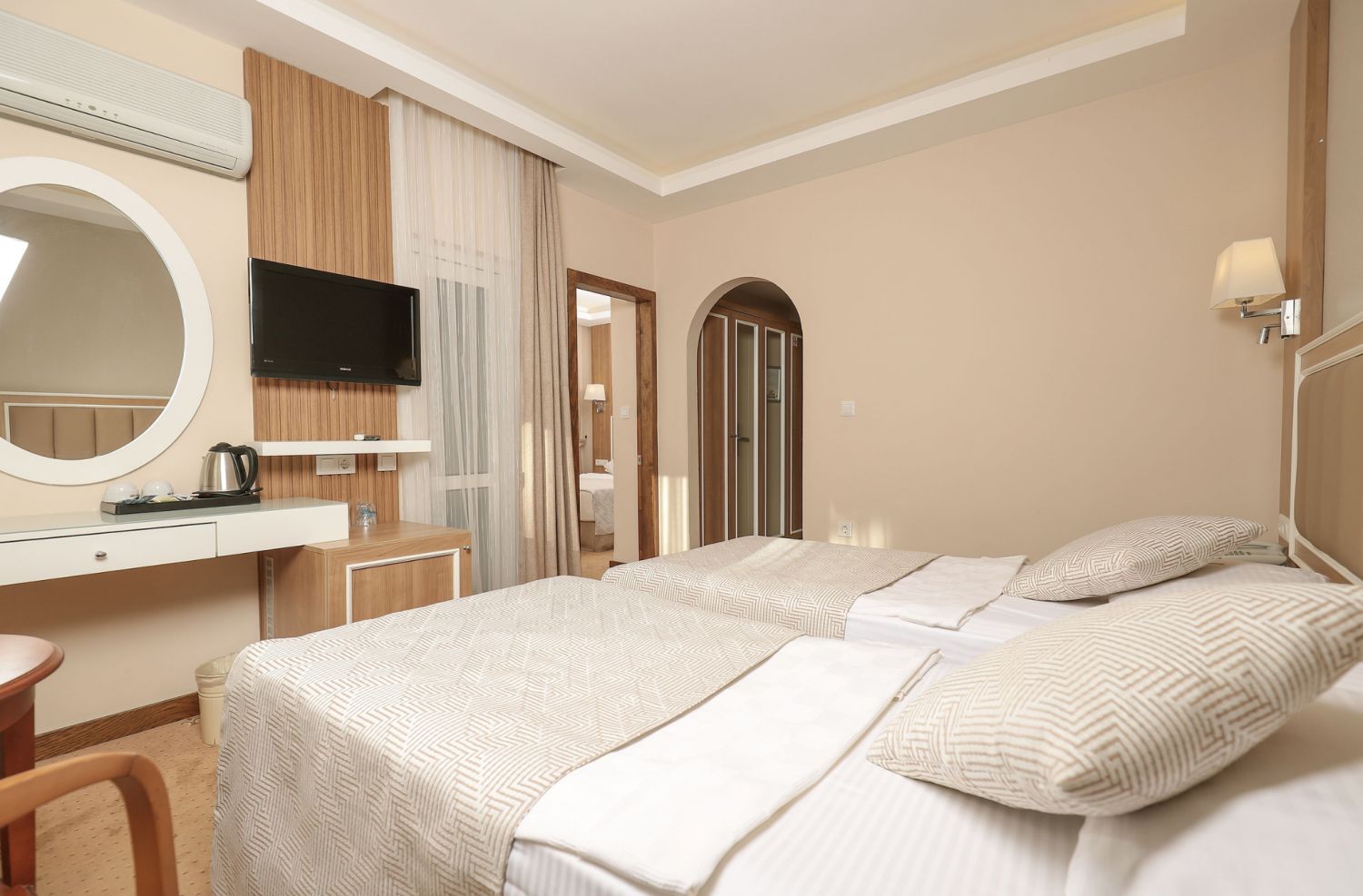 Всички стаи са оборудвани с климатик, телевизор, телефон, баня с душ/вана, сешоар, минибар (безплатно зареждане с вода и безалкохолни напитки ), сет за чай/кафе, сейф (безплатен), балкон или веранда. Почистване на стаите - всеки ден, смяна на спалното бельо и кърпите - 3 пъти в седмицата.