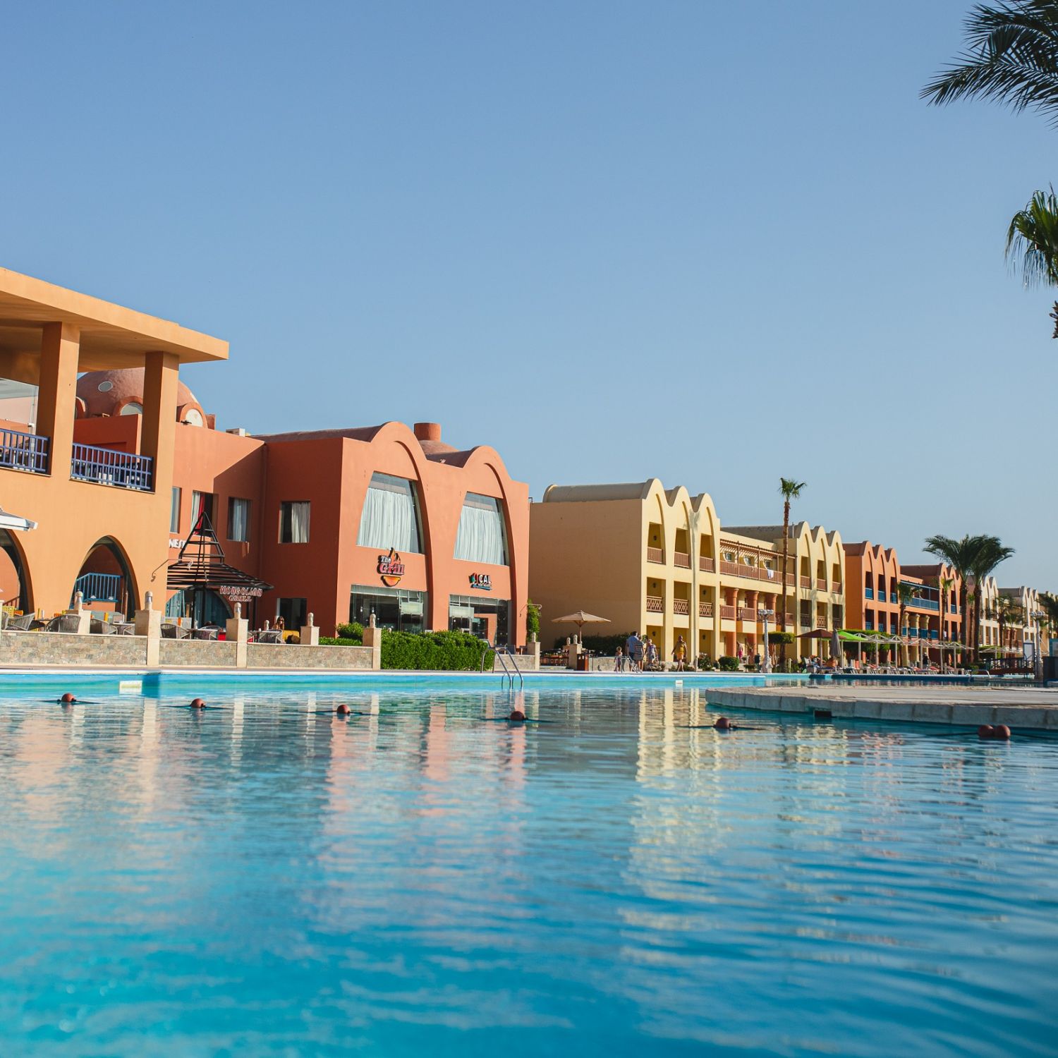 Намира се на 12 км. от летище Хургада, на 17 км. от центъра на Хургада, на брега на морето.