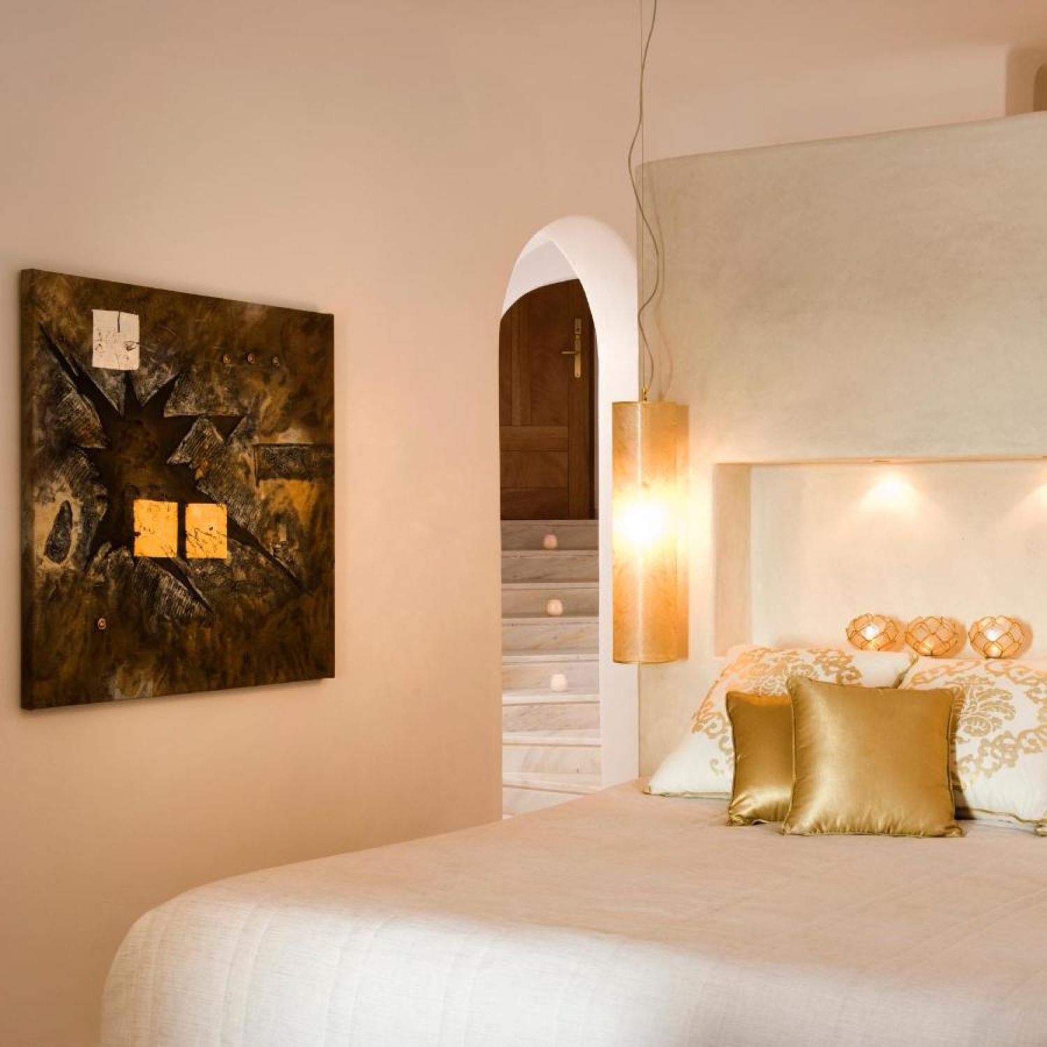 Климатик, телевизор, телефон, сейф в стаята, сешоар, халати и чехли, тоалетни принадлежности Apivita (гръцка натурална козметика), Мини бар Nespresso безплатно кафе, Безплатен WI-Fi 2, собствена веранда с гледка към калдерата и външен отопляем басейн, рум сервиз. Размер 50 кв. м.
