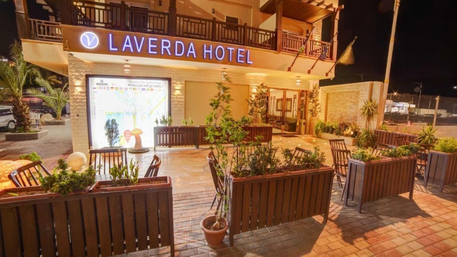 Laverda Hotel 3* се намира на 500 метра от плажа Ал-Гандур. Кралският яхтен клуб се намира на 1,7 км, а залива Тала е на 15 км. Международното летище „Крал Хюсеин“ се намира на 11 км от хотела. Laverda Hotel 3* се намира на оживено място с множество заведения и магазини. Хотелът се намира също така в близост до Музеят на Акаба и Замъкът Мамлук.