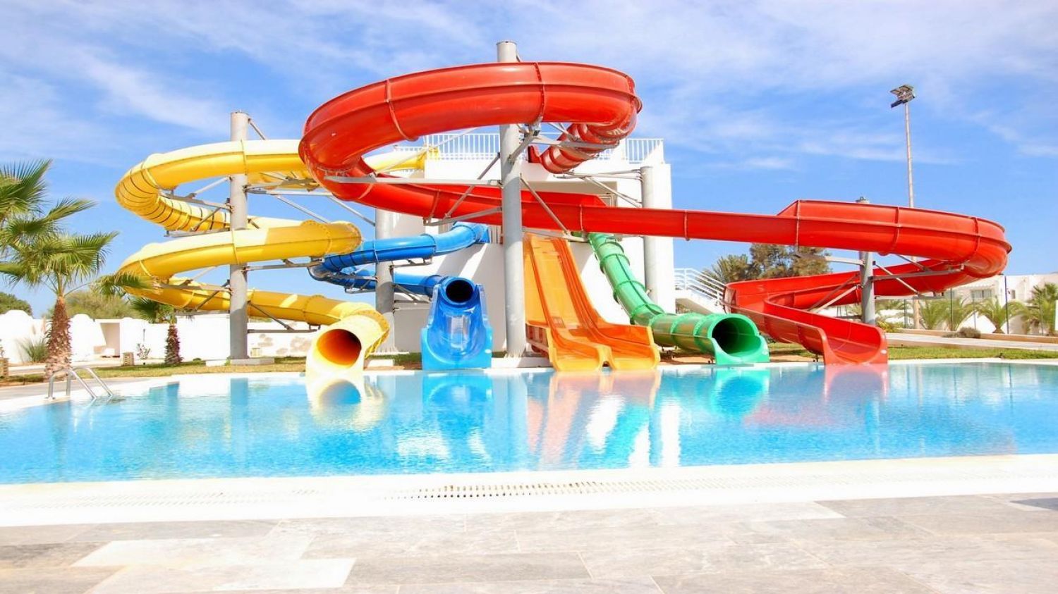 Плувни съоражения: основен открит басейн с прясна вода (1800 кв.м), открит басейн с прясна вода (1000 кв.м), детски басейн.
