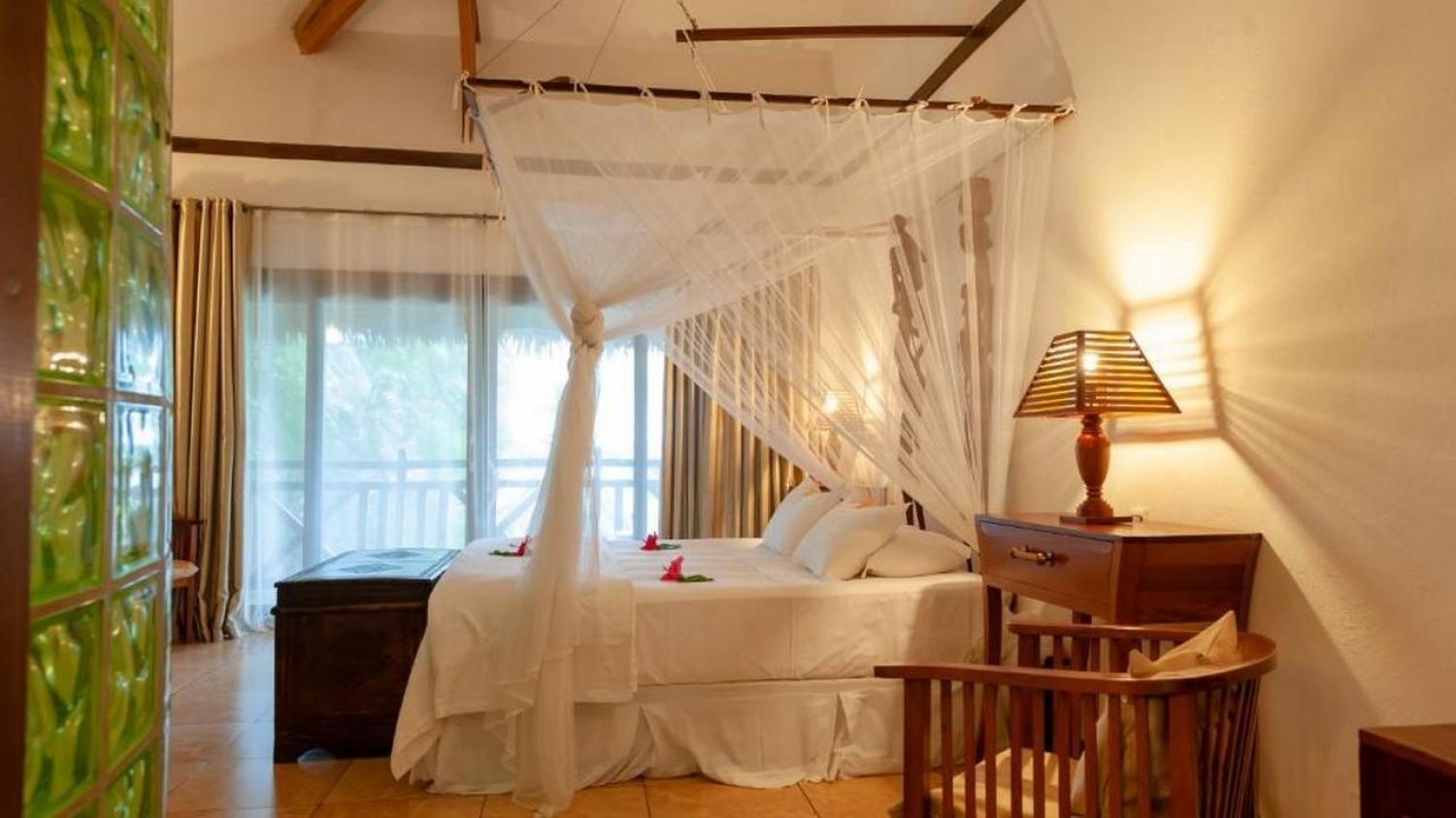 Всички климатизирани стаи и бунгала са с изглед към градината, а някои от тях имат изглед към морето. Включват също кът за сядане със сателитна телевизия и минибар. Всяка баня включва халат, чехли и безплатни тоалетни принадлежности. Леглата са покрити с мрежа против комари.