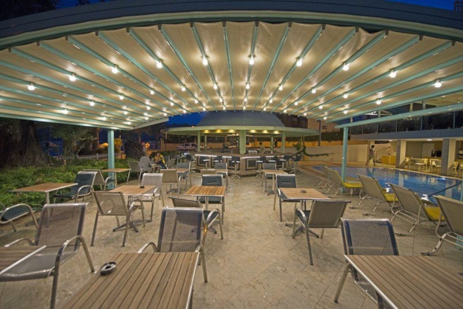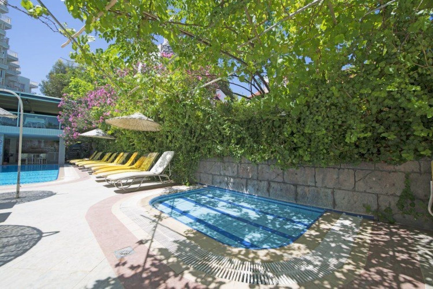Собствен, пясък/чакъл. На басейна и на плажа: чадъри, шезлонги - безплатно; матраци - платено. Плажни кърпи - депозит.