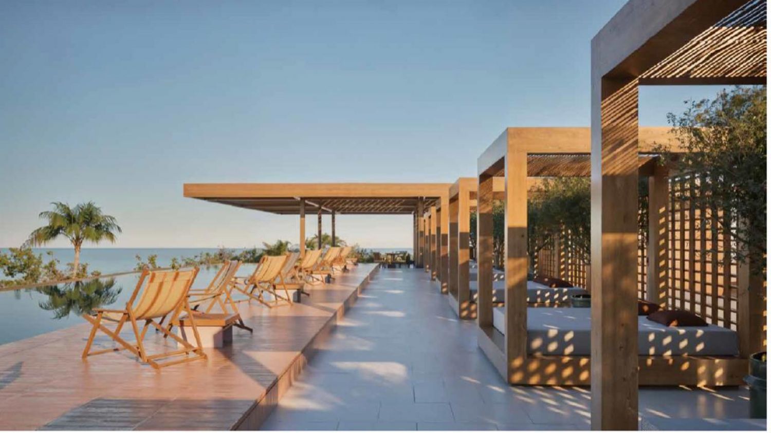 Открит басейн: Басейн с шезлонги и чадъри, предоставящ комфорт и релакс.