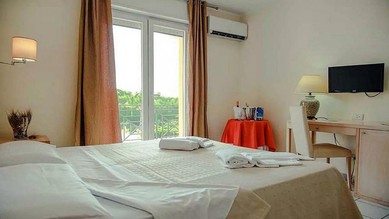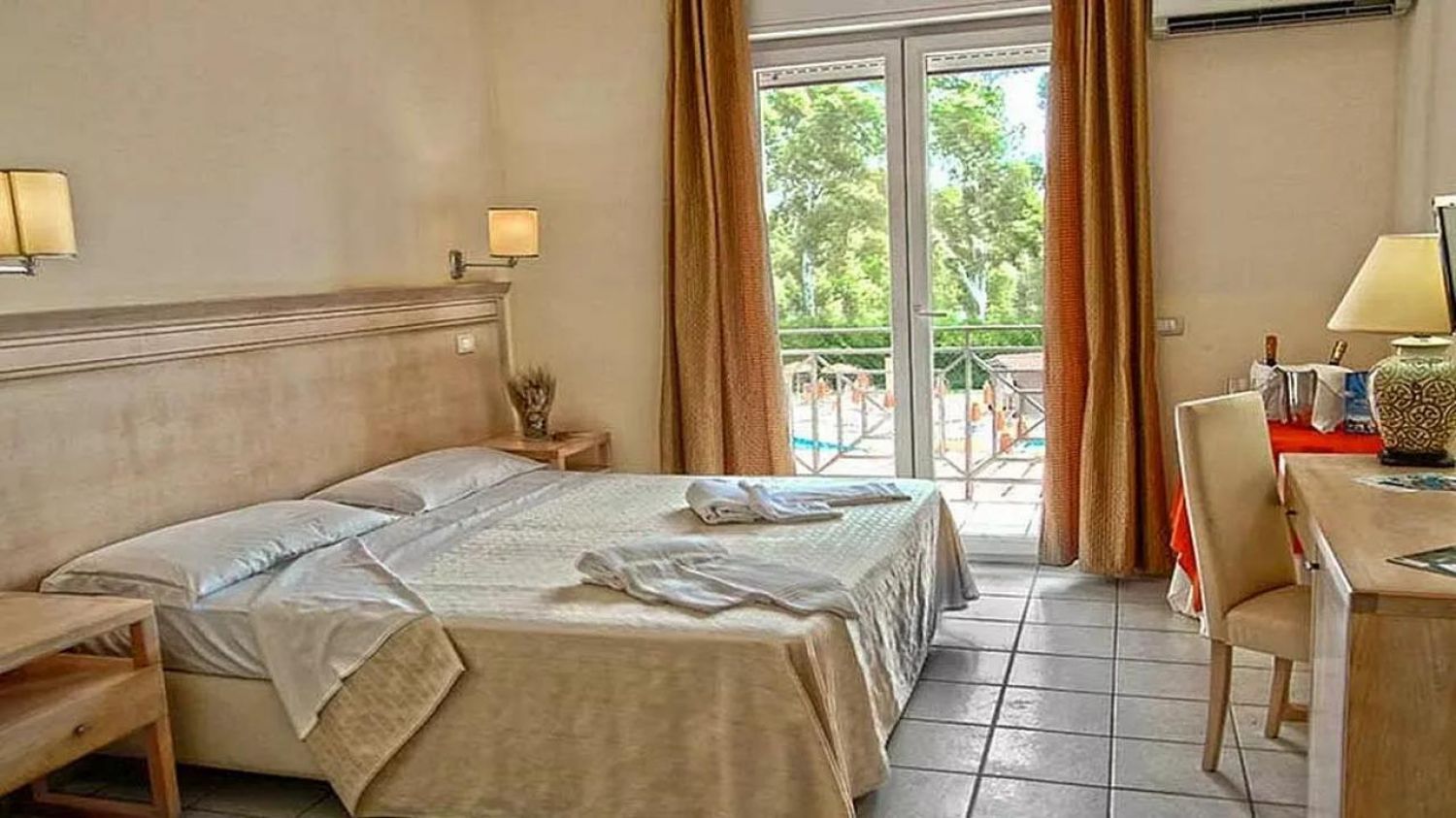 Хотелът предлага на своите гости 146 елегантни и удобни стаи, които могат да настанят от двама до петима души, разположени в два корпуса, в двуетажни сгради с асансьори. Всички стаи са оборудвани със самостоятелен санитарен възел, автоматичен климатик, телефон с директна линия, сателитна телевизия, бар-хладилник (зареждане при поискване), сешоар и сейф. Всички стаи имат малка тераса, оборудвана с маса и столове, която гледа към хълма или басейна.