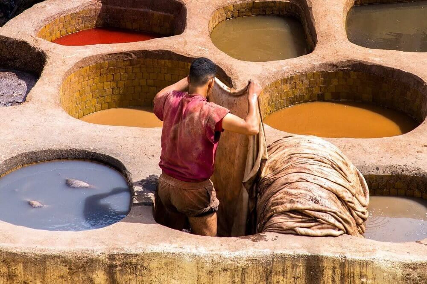 Ще се отбием първо до Кралския дворец със седемте златни порти, където ще слезем от автобуса и ще направим снимки отвън. Непосредствено до него ще посетим старият еврейски квартал наречен Мелах, създаден през 1438 г. После ще потеглим към хълма, на който е разположена една от старите наблюдателници на Фес, наречена Борш, от където ще се насладим на Медината от високо. След като приключим с пейзажите, ще посетим старата Медина с над 9 000 лабиринтни улички, която е най-голямата пешеходна зона в света - паметник на Юнеско. Ще влезем през главната порта Баб Божлю, за да можем да се пренесем векове назад и да усетим как са живеели и работели местните в миналото. Ще видим как се обработва и боядисва известната мароканска кожа, посещавайки една от най-старите им фабрики Шуара. Ще се отбием до площада Нежарине - мястото, където се свързват всички улички от Медината. След това ще посетим занаятчийско ателие-музей, където ще видим обработката на бронз, гравирането върху него на ръка от местен майстор, както и известните ръчно обработени лампи на Фес. Разбира се на това място ще имате време и възможност да си купите сувенир за спомен. Когато продължим с разходката ще минем покрай сградата на стария воден нощен часовник на Медината – Клепсидра, след което ще посетим красивото медресе Боу Инания. Ще имаме възможността да видим от вън първия университет в света създаден от една тунизийка – Фатима ал Фихрия. Ще видим отвън джамията, в която се намират тленните останки на създателя на Фес - Мулай Идрис (IX век). Фес е известен със своите текстилни ателиета, които ще посетим, за да се запознаем отблизо с традиционното облекло на мароканците. Ще имаме възможността да се облечем с тях и да си направим снимки за спомен, а който поиска може и да се спазари с местните продавачи, за да си купи нещо по желание (все пак отиваме към пустинята, където всички са облечени в традиционни дрехи и шалове)