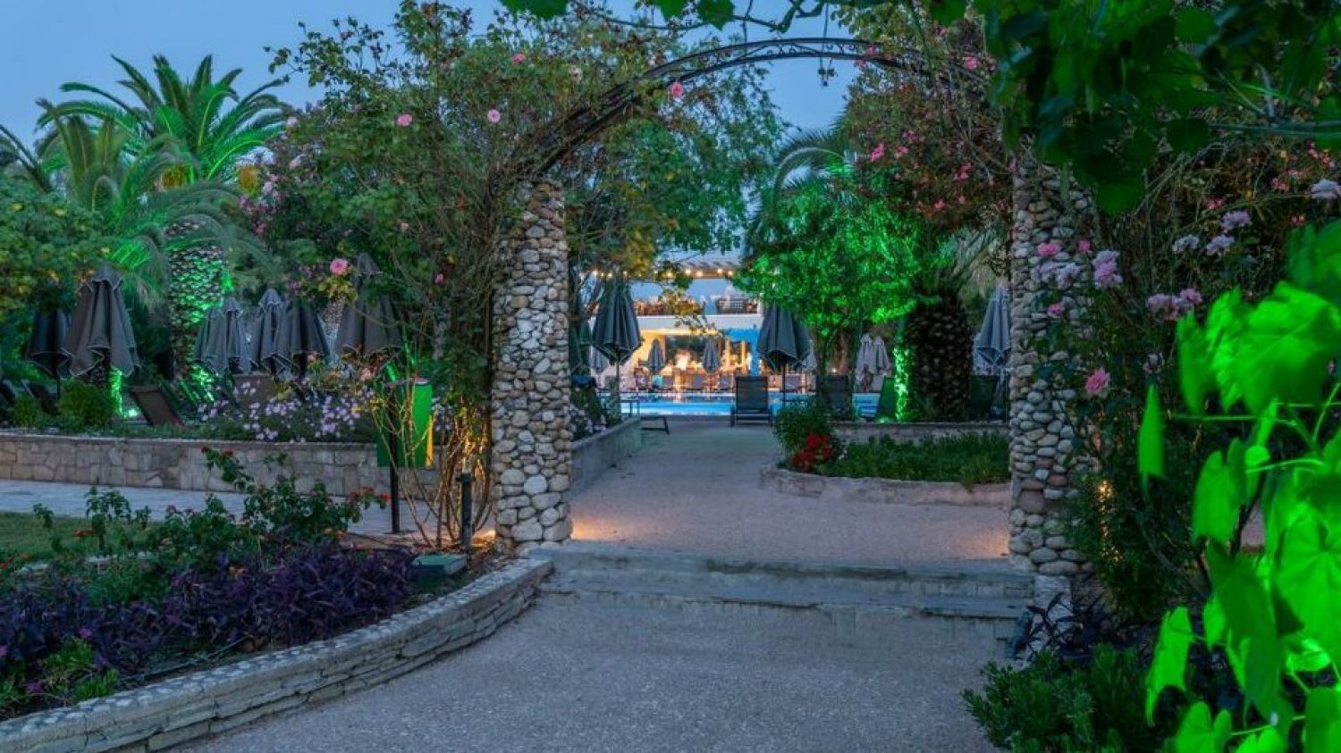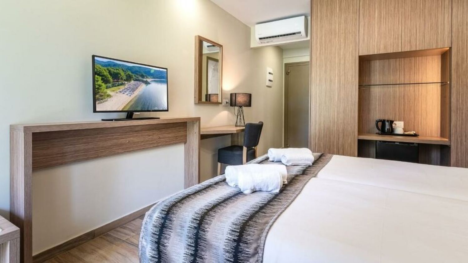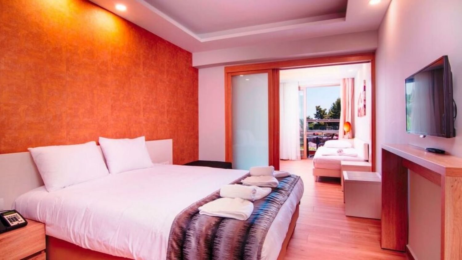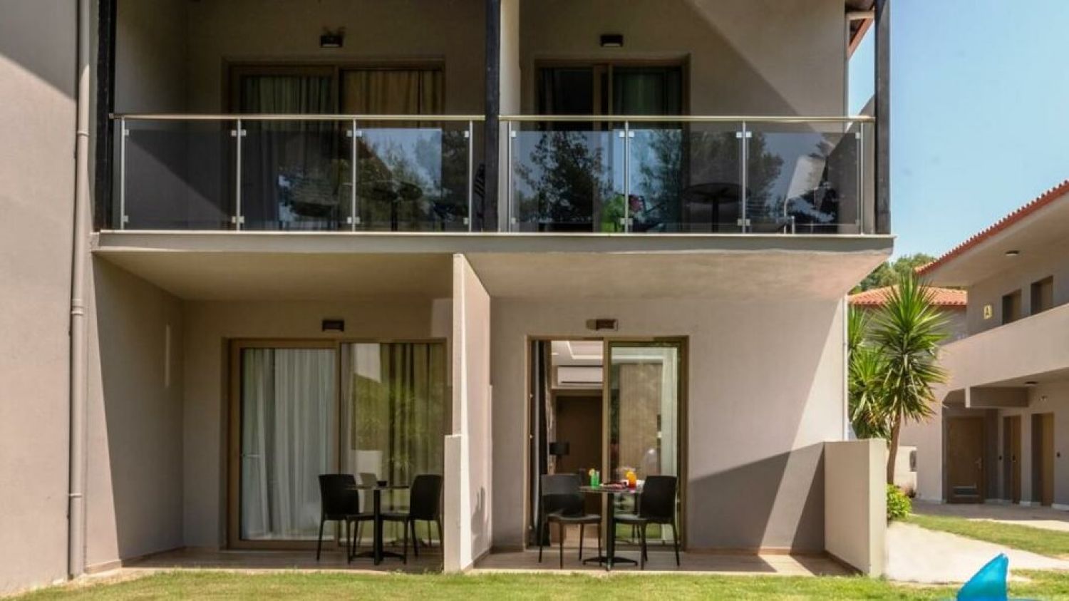 Tucked away basically in a private bay, 10km from Neos Marmaras, Poseidon Resort is an oasis of peace and quiet, ideal for family vacations. Built in a traditional style, respecting the nature and the environment, amidst the blue of sea and the green of the mountain, Poseidon Resort consists of 11 buildings with rooms and suites and the main building with the reception, restaurant and the bar. Operating on all inclusive basis, hotel offers all kinds of entertainment and fun for the kids and adults alike - ranging from daily children animation, mini club, playground, outdoor swimming pool, sun beds and umbrellas, beach volleyball, tennis court, mini football, table tennis, to organized beach and pool activities, free Wi-Fi and organized Greek nights and live music... Impressive coastline, small cove, gentle hills, the mountain on the one hand and the vastness of the sea on the other, in a unique location surrounded by pine trees, this hotel is on a sprawling verdant garden of 24 acres. Olives, pine trees, palm trees, fruit trees and many endemic flowers hide away a haven of relaxation and family holidays.