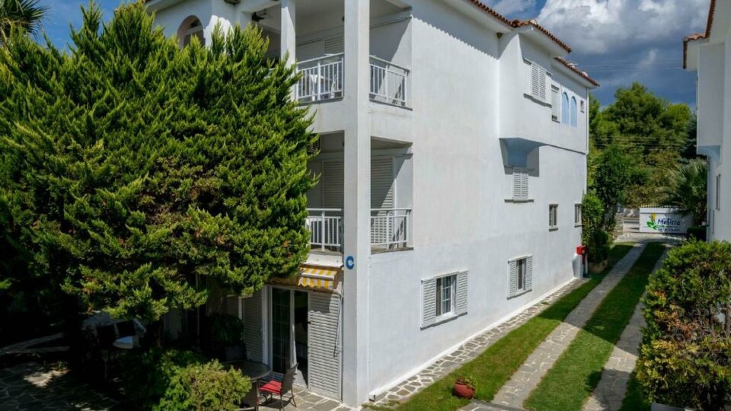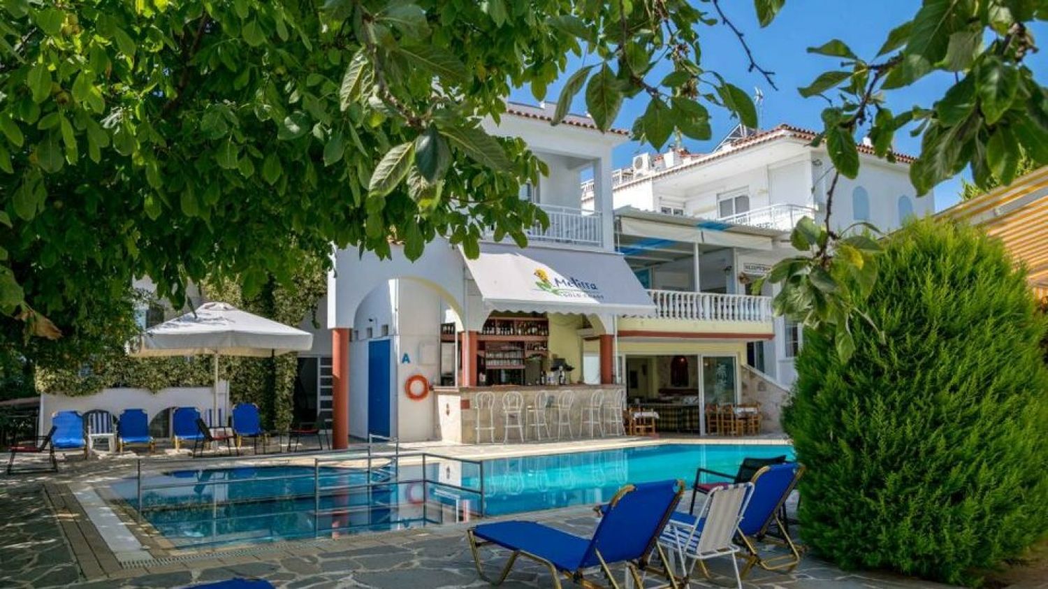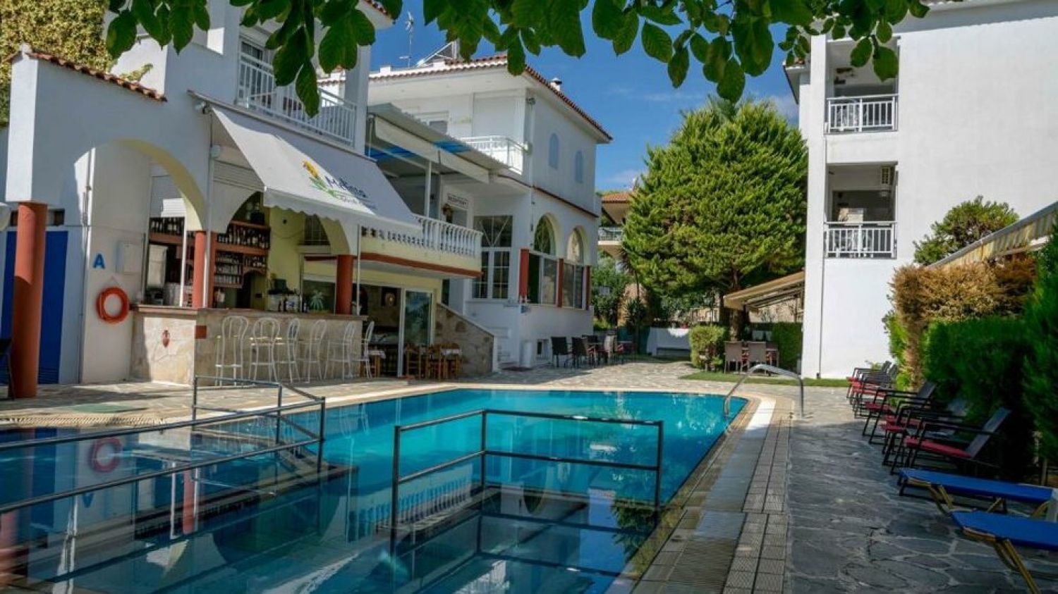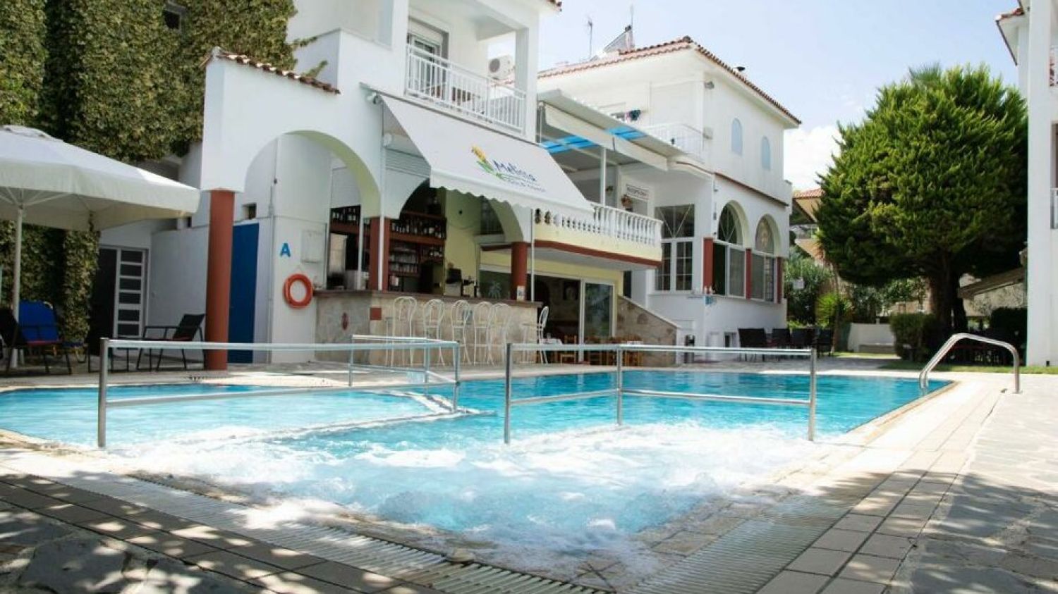 Searching for a place where you can spend careless holidays, we came across the Melissa Gold Coast. At a distance of 80km from Thessaloniki and the international airport, among the magical pine trees, about 80m from the organized sandy beach, in the Halkidiki peninsula, Sithonia prong, in the village of Psakoudia. Melissa hotel consists of 4 buildings at 80m from the beach and one two-storey building about 5 minutes away from the main complex. Hotel offers 63 different room types, a well tended garden, outdoor pool, and a beach bar with sunbeds and umbrellas. Rooms overlook the garden or the pool, some are on ground floor, some on upper floors, but all equipped with the necessary facilities: fridge, TV, A/C, hair dryer, balcony or a veranda. Hotel services include a traditional Greek breakfast, free parking, daily cleaning, safe boxes at the reception, free wifi in all areas as well as the beach bar. There is also a watersports point, small football court and the center of the village with the taverns and shops is at 60m distance.