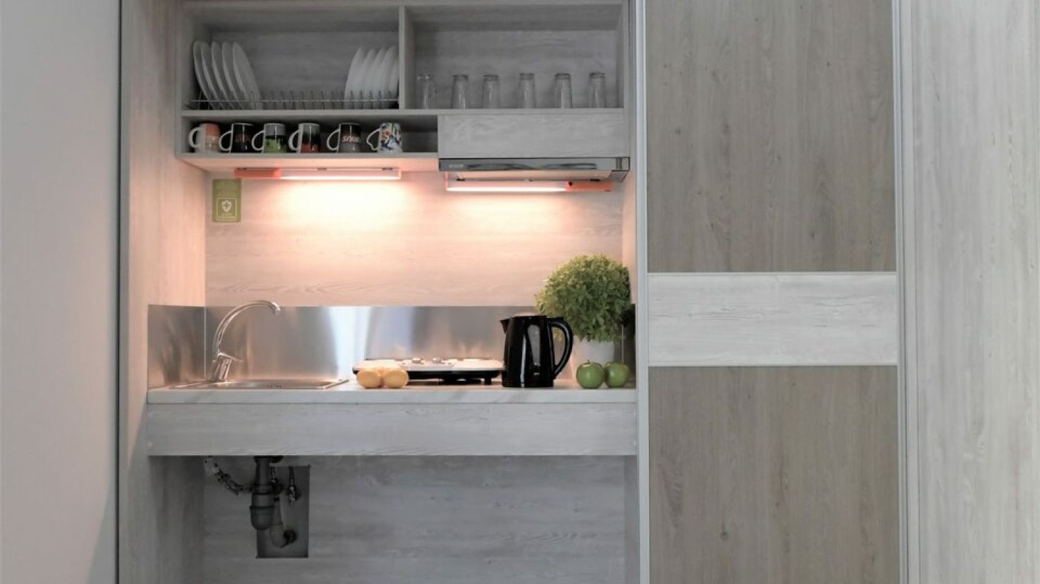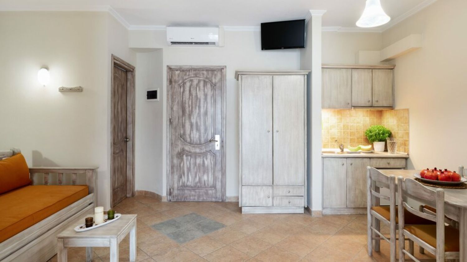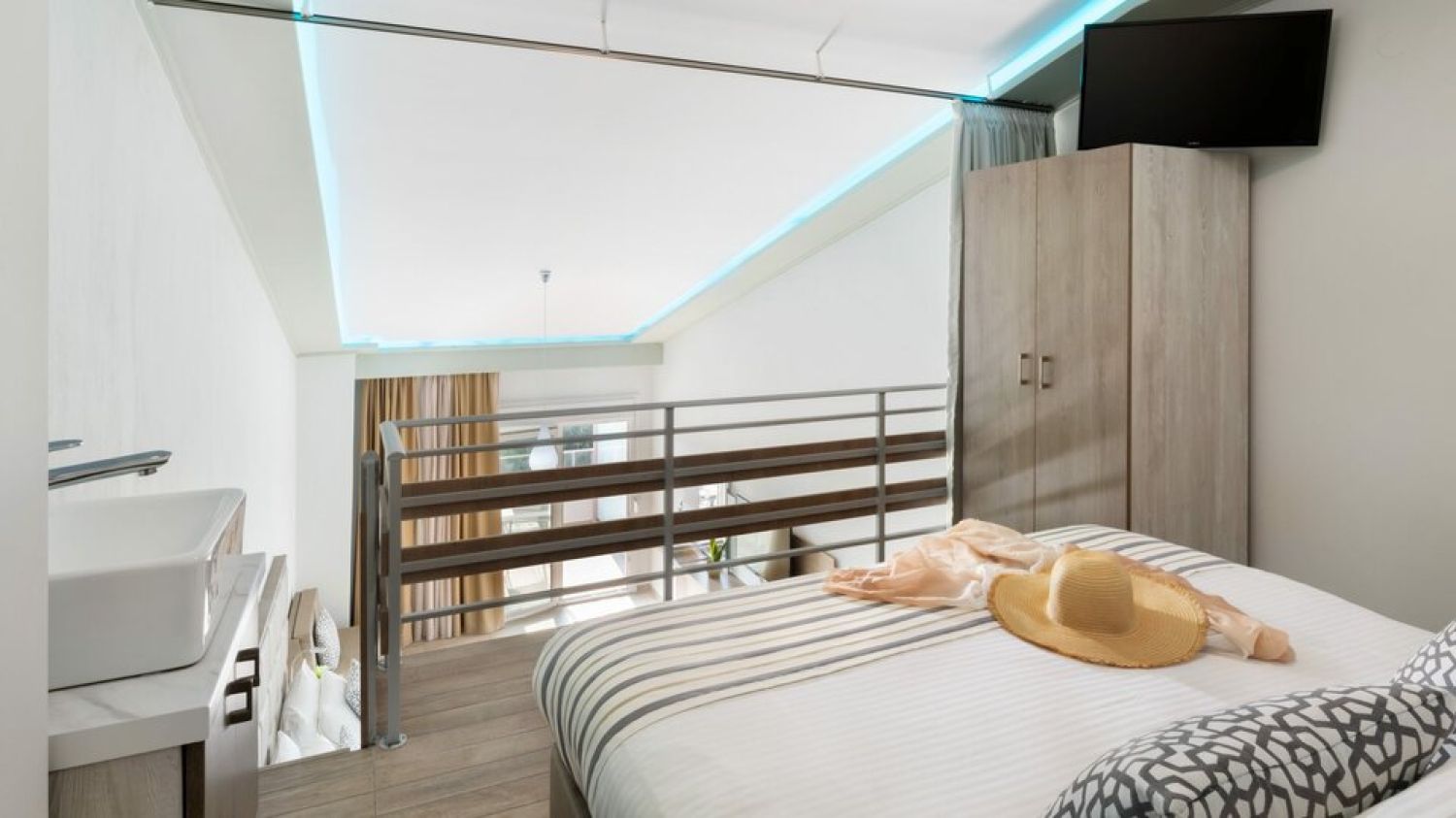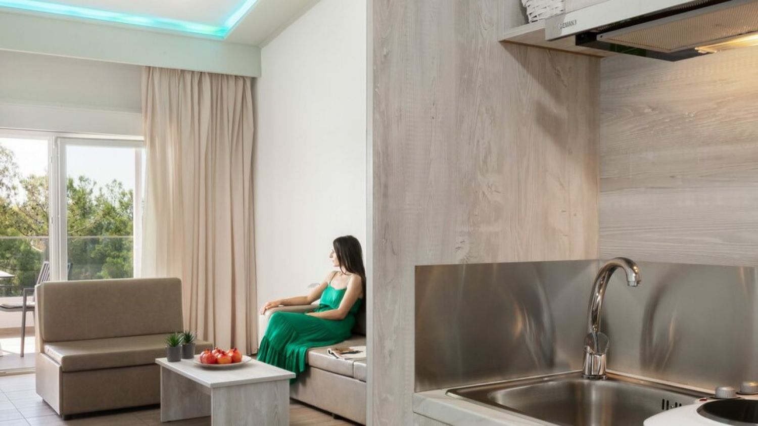 The complex consists of two buildings: the Main Building, featuring a reception area, pool and pool bar, and a breakfast buffet area; and the Reflections Building, which houses standard studios. Rooms are airy and modern, each with a private balcony, air conditioning, TV, safe, free Wi-Fi, and a kitchenette. Guests can enjoy an American breakfast buffet by the pool each morning, with options for room service breakfast and poolside snacks. Free public parking is also available nearby.