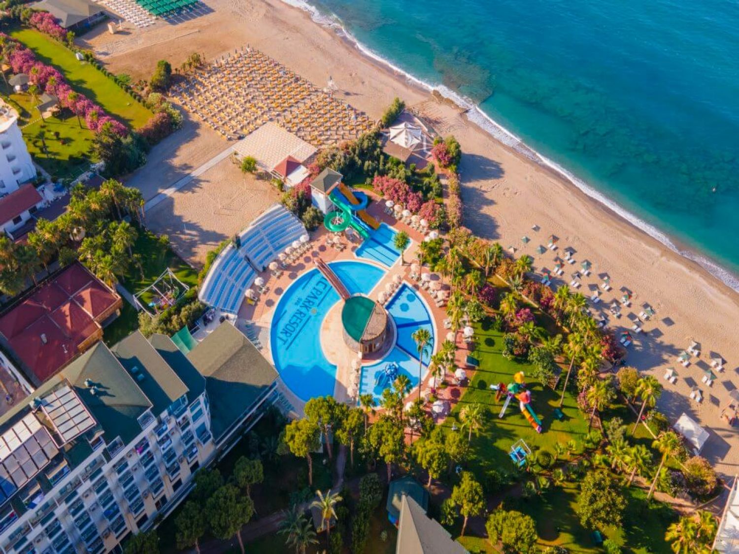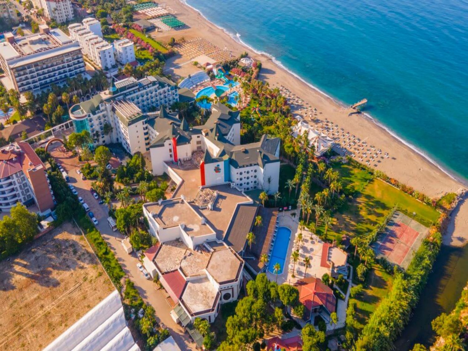Основен ресторант, а - ла - карт ресторант, 4 бара, 4 открити басейна, 1 закрит басейн, 3 водни пързалки и кино, СПА център, магазини, пералня (платено), 2 конферентни зали, футболно игрище.Безплатни услуги: турска баня, сауна, фитнес център, аеробика, дартс, плажен волейбол, баскетбол, дискотека, анимация.Платени услуги: