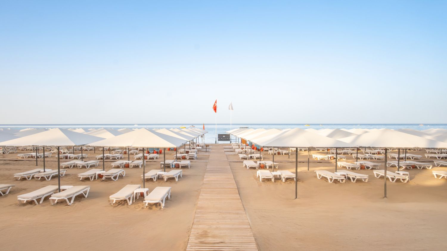 Собствен, пясъчен. Чадъри, шезлонги и плажни кърпи на плажа и при басейна - безплатно.