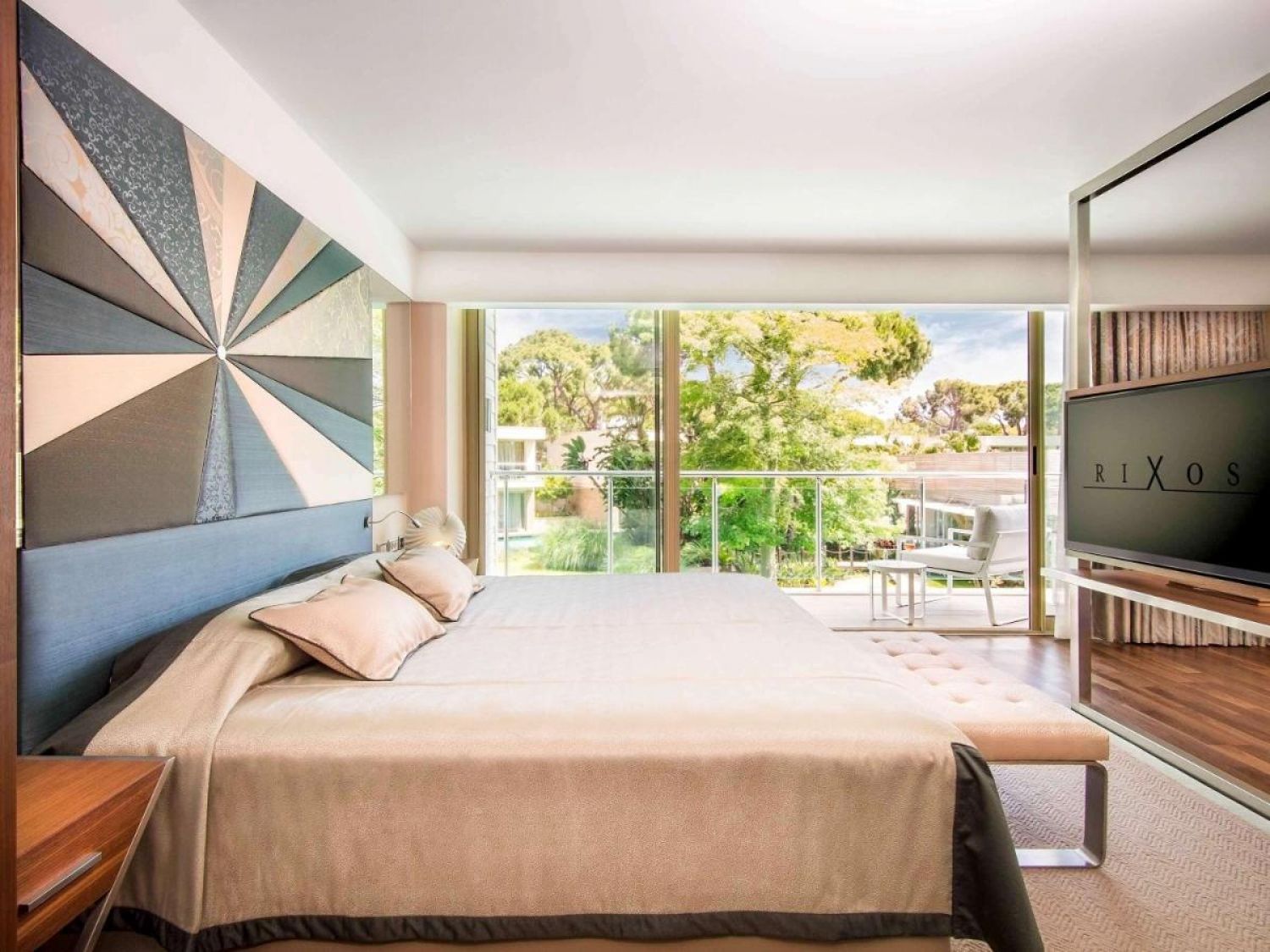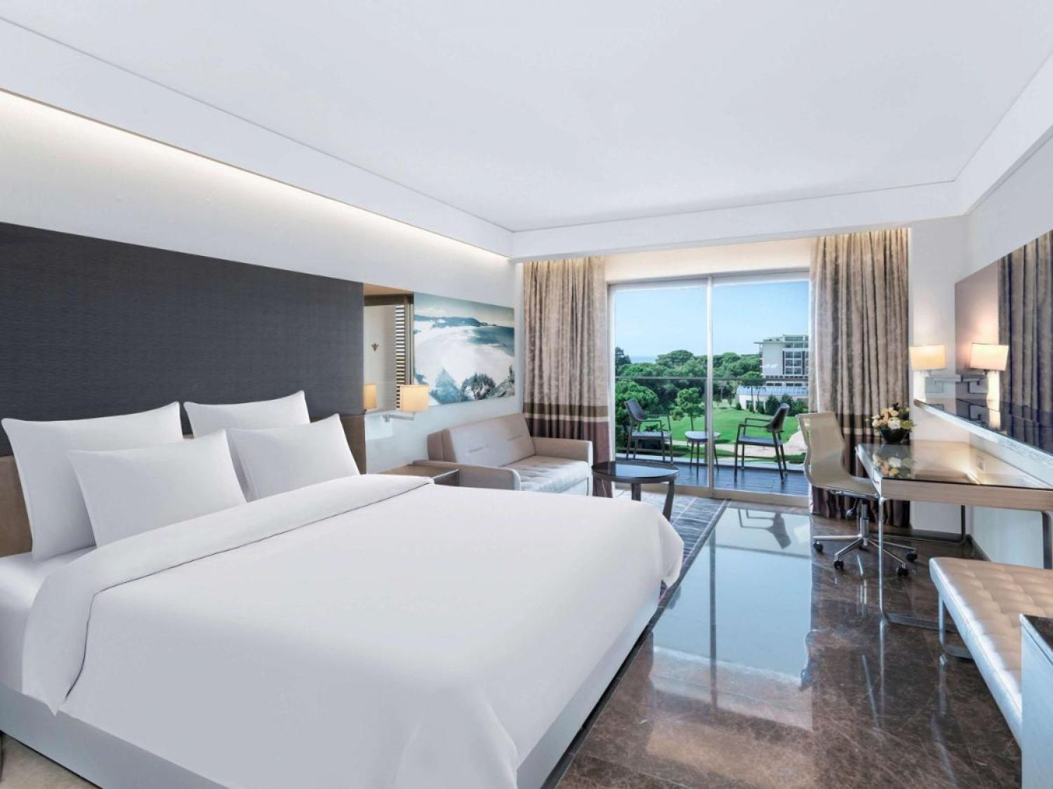 Deluxe Suite: 73 м2, 1 спалня с 1 хол, разделени с пеходна врата, мини бар, огледална телевизия, интернет, директна телефонна линия, централен климатик, сейф, балкон, сешоар, сет за чай и кафе.