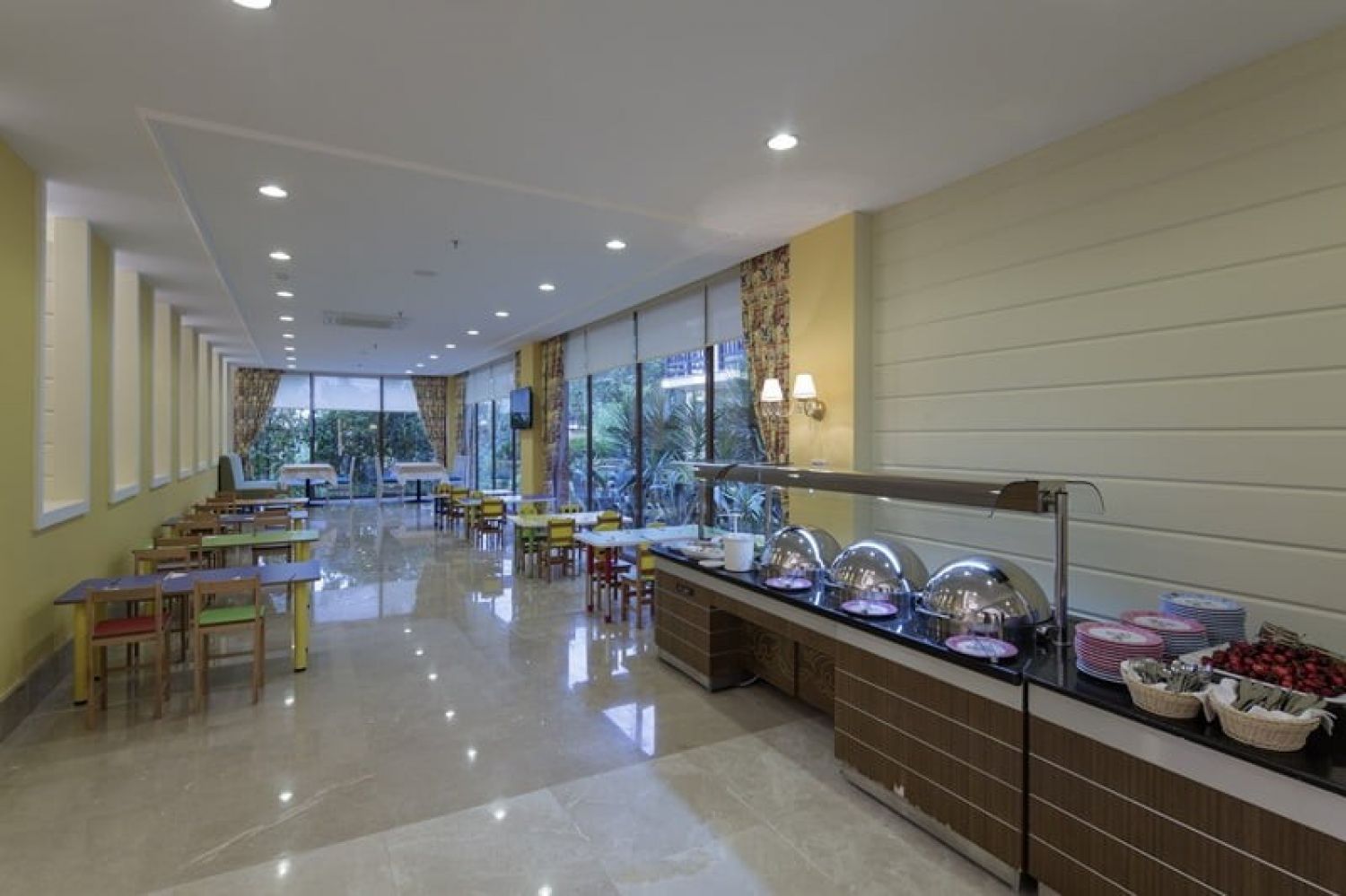 Изхранване: ALL INCLUSIVE (24 часа) - Закуска, обяд и вечеря на бюфет, диетичен бюфет, вечеря с различни тематични вечери и турски специалитети, 2 A’la Carte ресторанта (азиатски и рибен с предварителна резервация), снек-бар до басейна и плажа, местни алкохолни напитки (водка, джин, вермут, билков ликьор, ликьори, раки, бира, различни вина и други), безалкохолни напитки, различни плодови сокове, тоник, айрян, бутилирана вода 0,5 л, турски чай и кафе, филтрирано кафе, американско кафе, еспресо, билков чай.
