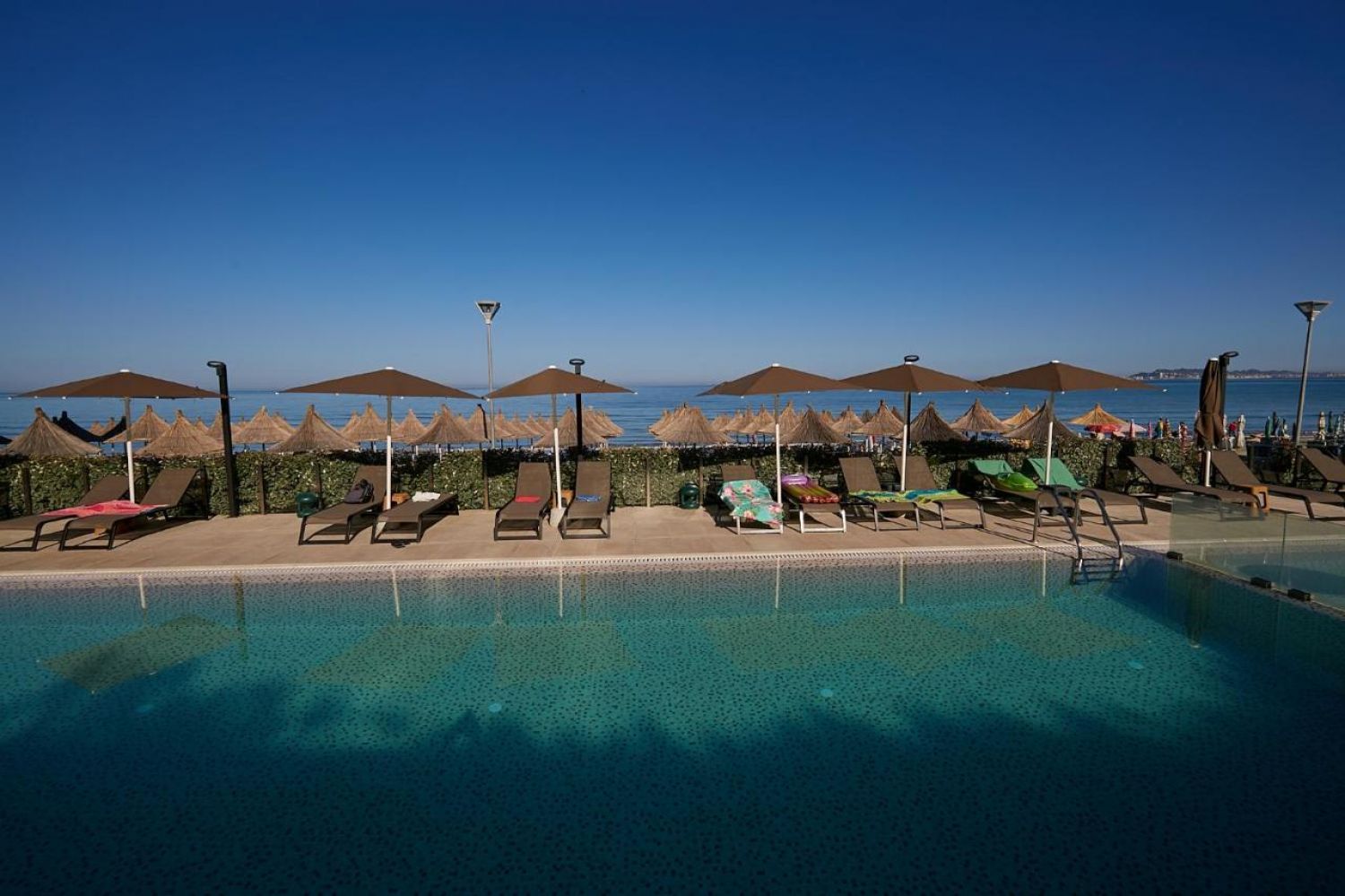 Собствен - пясъчен. Чадъри и шезлонги на плажа и басейна - безплатно.
