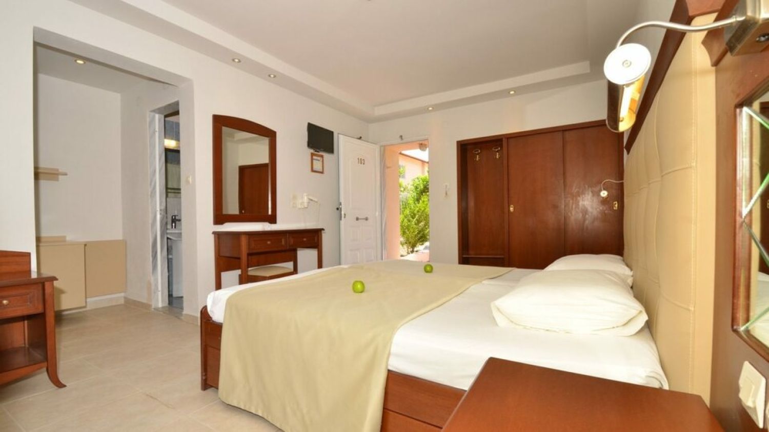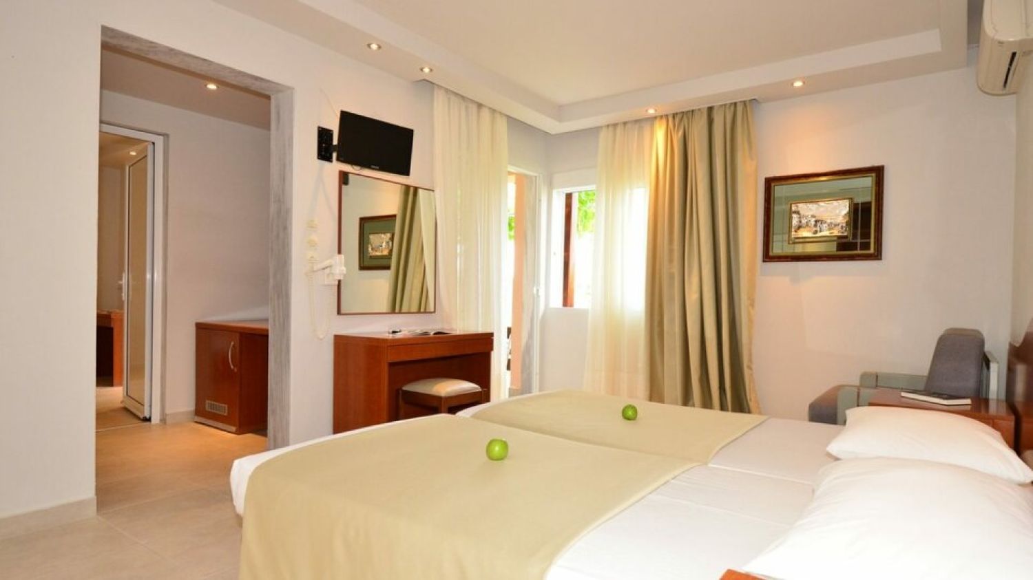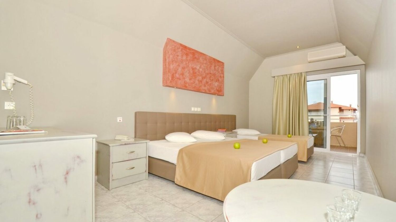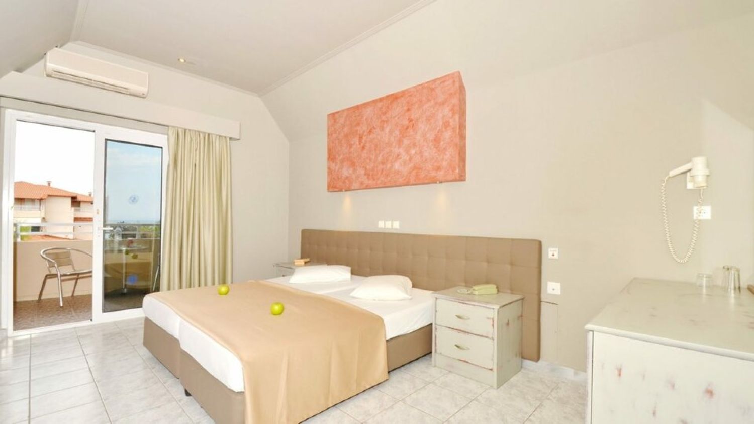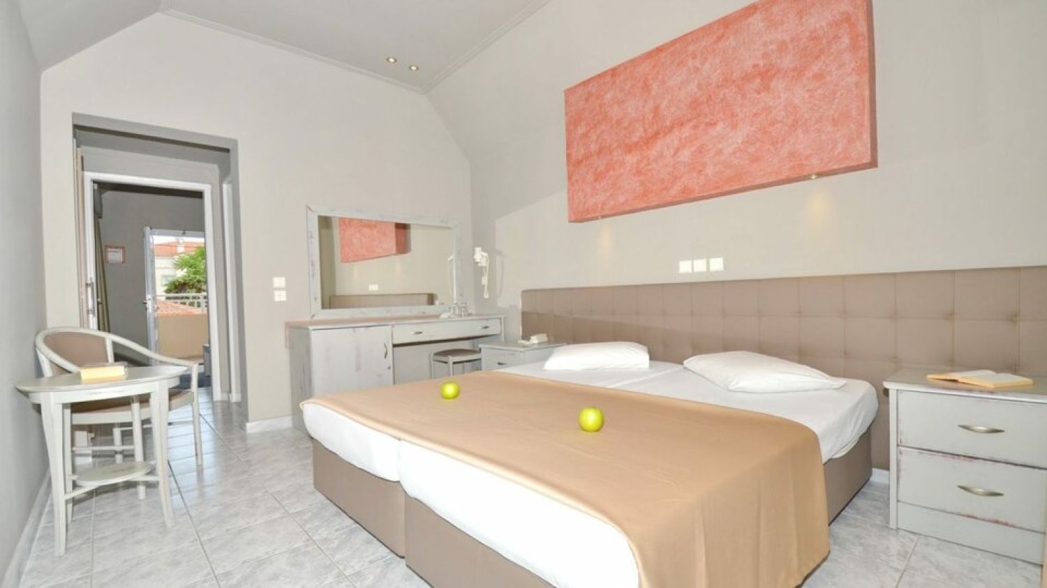 Set on Hanioti beach along the Aegean Sea, Sousouras hotel and bungalows features a main building with the restaurant and pool bar and 9 large buildings set among a beautiful Mediterranean garden. Recently renovated rooms and pool area promise a relaxing, laid-back holiday in a family atmosphere. 80 pleasant and spacious guestrooms and bungalows, made of colors and materials in harmony with the beautiful natural surroundings, are waiting to provide you with a genuinely comfortable stay. Hanioti is a small coastal town in the peninsula of Kassandra, in Halkidiki, a picturesque and vibrant destination, ideal for spending relaxing holidays on the beach front Sousouras hotel. This excellent value for money half board hotel is located near the center of Hanioti, 4 km from Pefkochori, and 95 km from Thessaloniki Airport. A/C with extra charge 7eur per day.