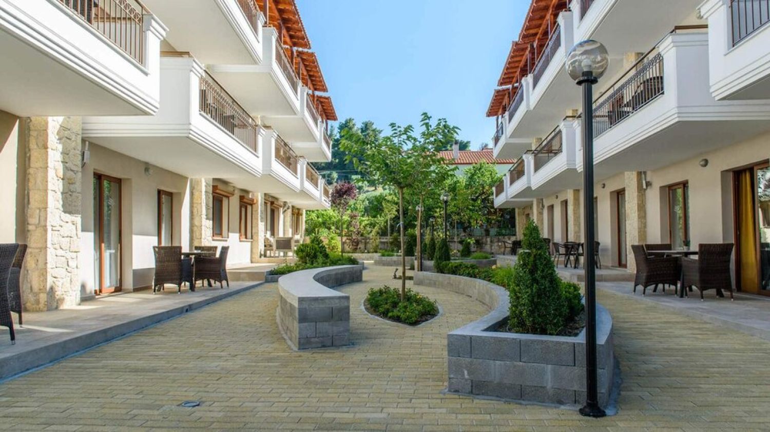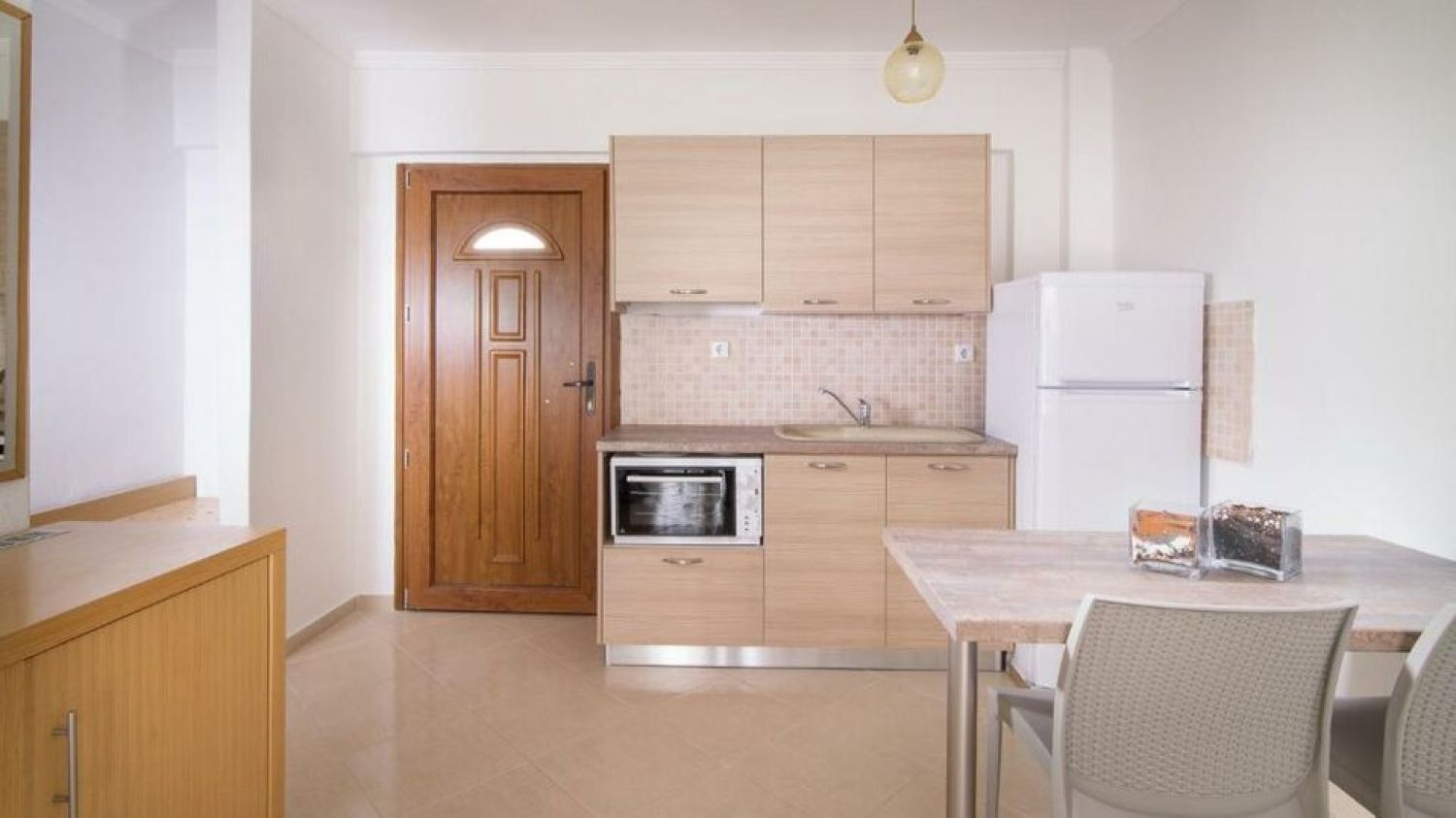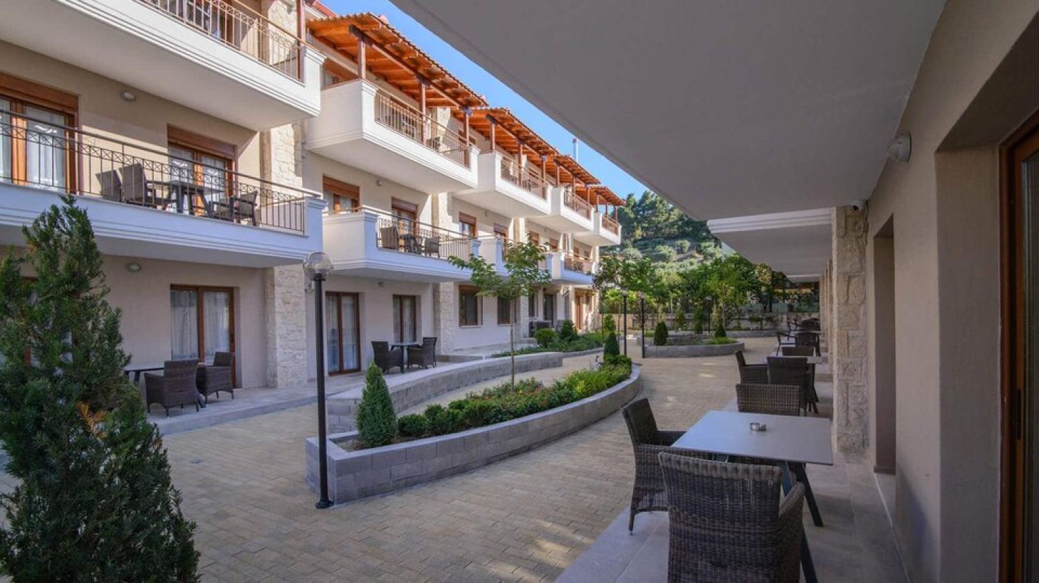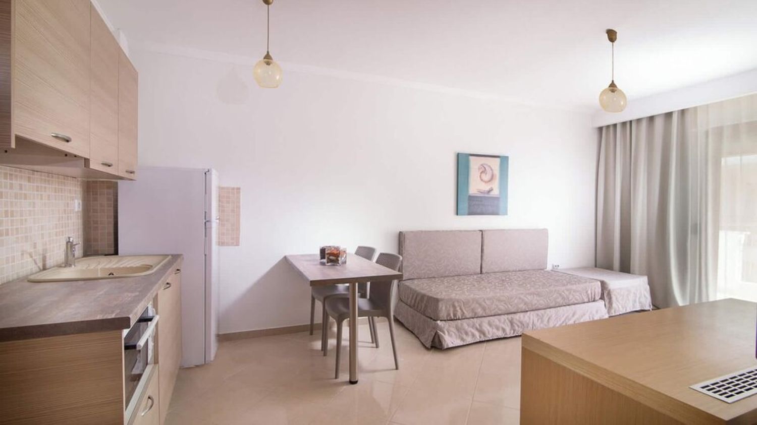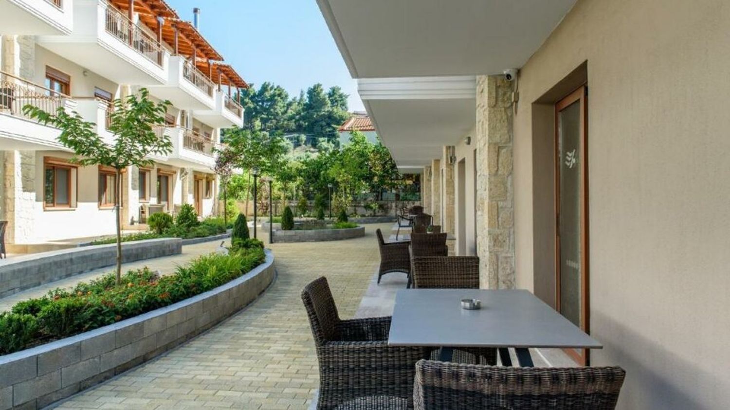 Apanemia by Flegra Hotels is a brand new complex of apartments, built in 2017, situated in the old center of Pefkohori village, in the peninsula of Kassandra. It is only 50m away from Pefkohori shopping centre, 150m from the bus stop and 100km from Macedonia airport in Thessaloniki. Apanemia apartments consist of two separate rooms, one living room with two single sofa beds and a couch chair and one bedroom with a double bed. They all have fully equipped kitchen facilities in the living room, bathroom with shower and balcony or terrace. The property can host a maximum of 5 people but does not provide parking facilities.