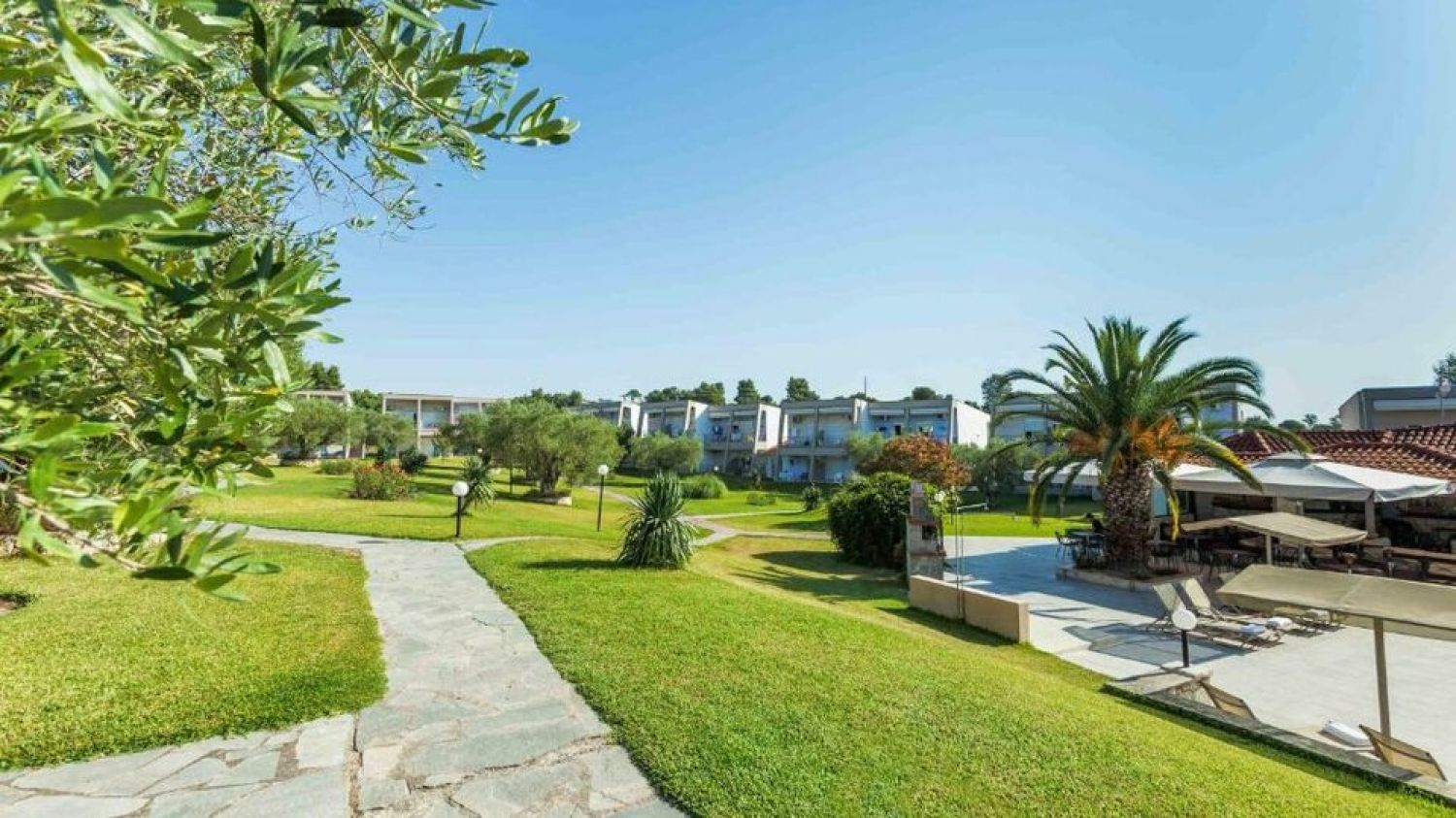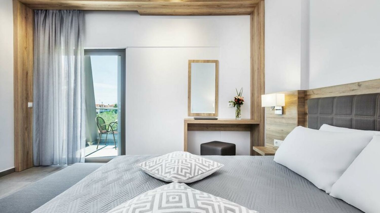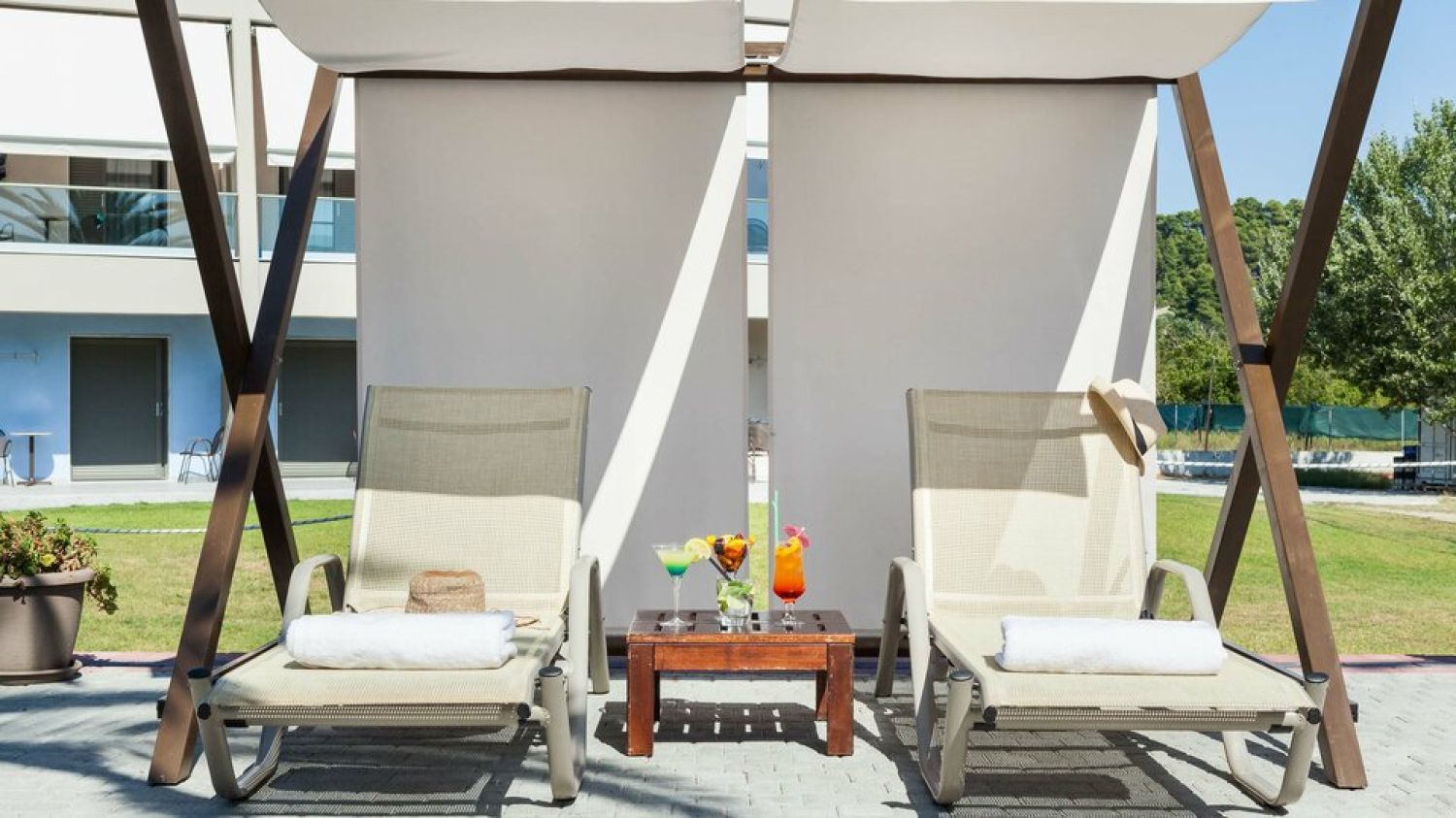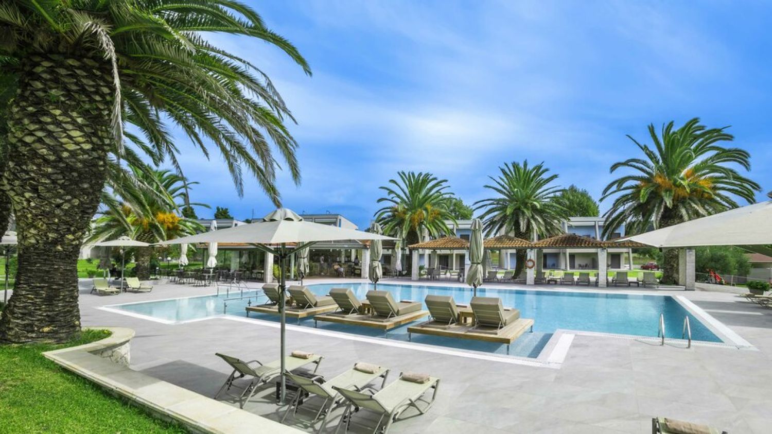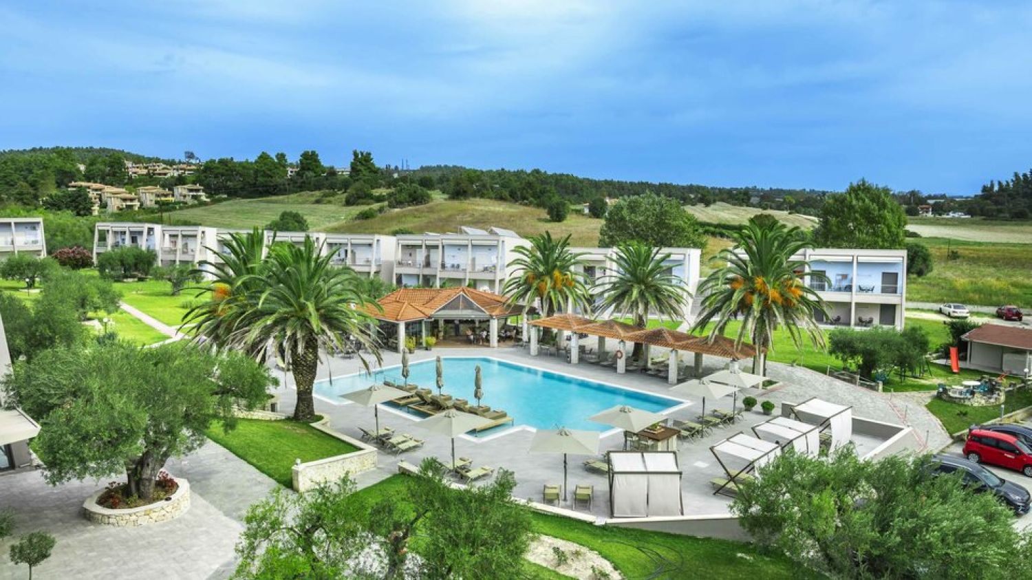 Nestled in one of the most laid-back areas of Kassandra, skirted by a lush pine forest, Iris Hotel is built on an area of 16 acres. Its 89 Rooms and 4 Deluxe Suites are positioned amphitheatrically, overlooking the pools and its large gardens, which are paved with grass, under the shadow of perennial olive trees, along with a variety of seasonal plants and large palm trees.Guests enjoy complimentary parking and breakfast, while the hotel features a laid-back buffet restaurant and an open-air bar. Moreover, the outdoor pool, dedicated kids’ pool, and a snack shop add to the leisurely ambiance. Beyond these, the property boasts lush gardens and sports courts, ensuring a well-rounded and enjoyable stay for all visitors.