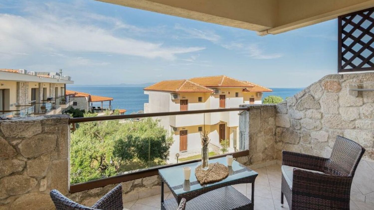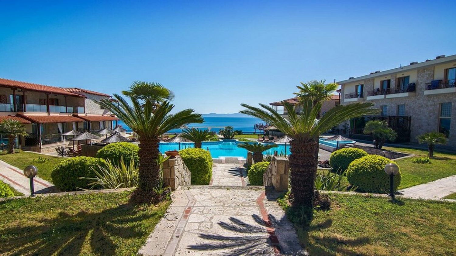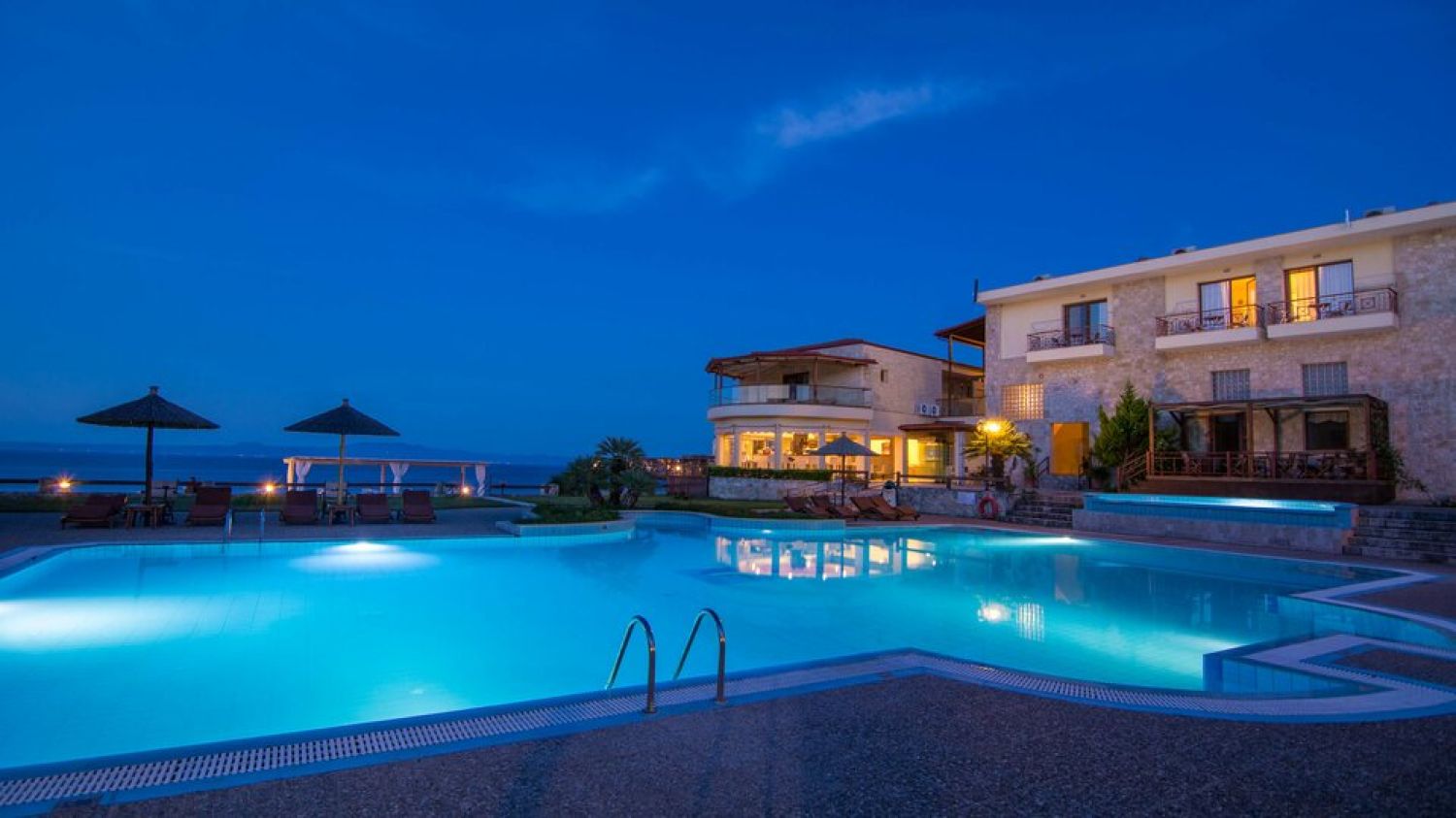 Nestled in an amphitheater on the hills, in the most beautiful part of the estate, 60 meters far away from the seaside and with a unique view to the endless blue of Toroneos Gulf and the Aegean.Established in 1997 with 22 rooms, Blue Bay Hotel marked its inception alongside the formation of Blue Bay S.A. In 2008, a significant expansion ensued, enhancing the hotel with new facilities and luxury services. Presently boasting 69 rooms and suites, each offering breathtaking views, our vision, guided by the Tsapanidis family, was to craft a haven of discreet luxury within a cozy atmosphere, nestled in a unique natural setting.The apartments are built with natural stones, exactly like those that were found in the ancient village of Afitos, that is near the hotel. The attractive, inviting turqoise waters of Halkidiki are accessible by a pathway, at 60m distance. The traditional stone built picturesque town of Afitos is at 1.3km, while the Thessaloniki airport is at 75km distance.Blue Bay Hotel serves as the perfect retreat for couples seeking serene relaxation, peaceful repose, and intimate moments amidst the captivating Greek summer ambiance.