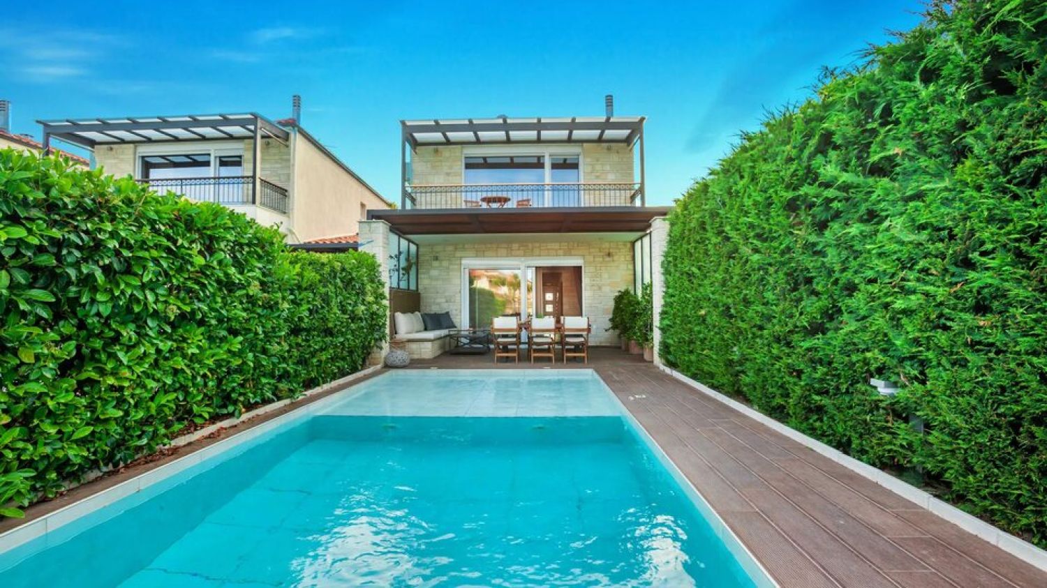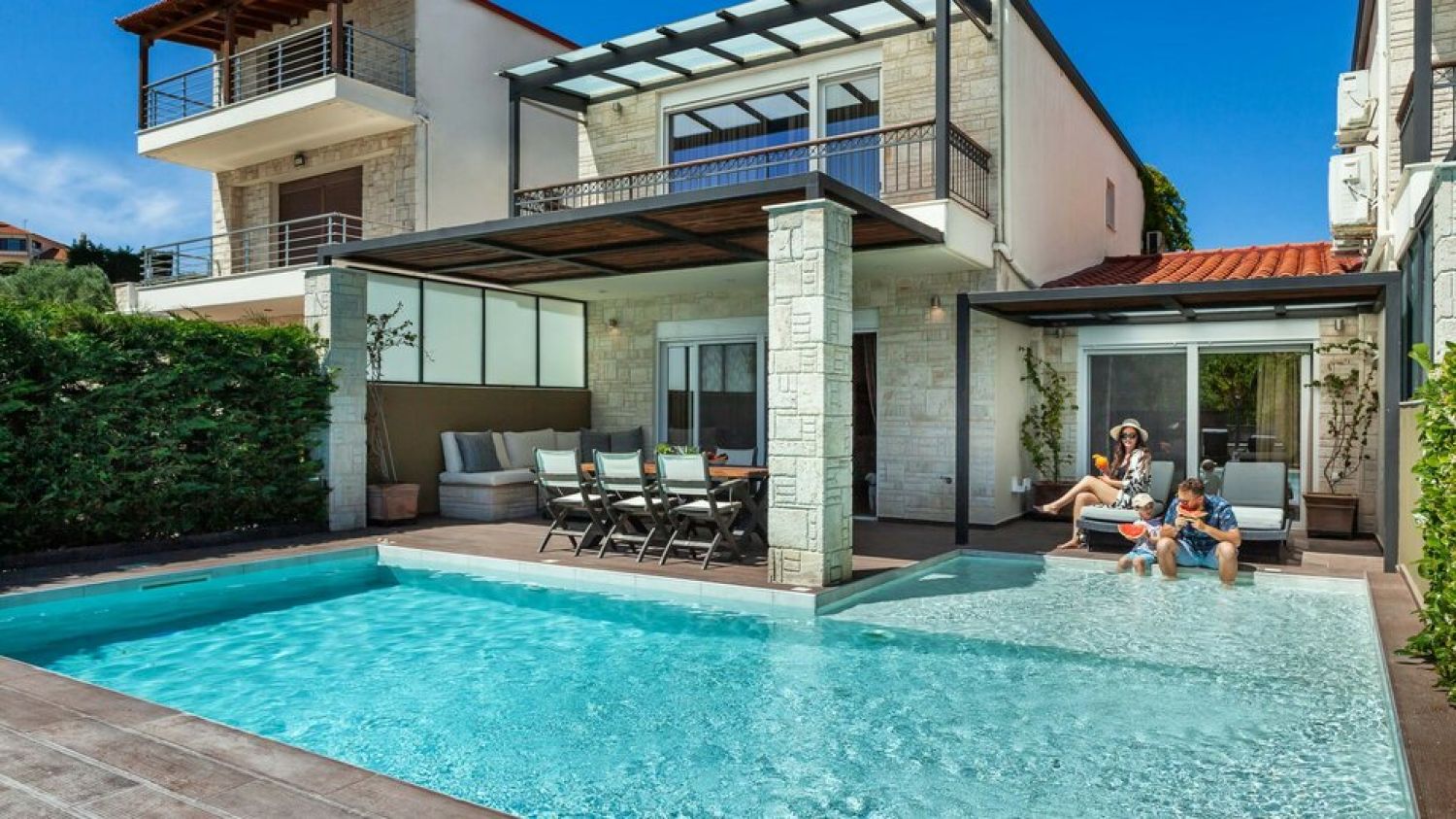 Picture yourself lounging by your private pool and jacuzzi, soaking up the sun, and creating timeless memories with your loved ones. As you absorb the breathtaking panoramic views of Hanioti village and the Toroneos bay, let the stunning backdrop of Sithonia peninsula and the majestic Mount Athos elevate you to a state of sheer euphoria. This idyllic setting promises an experience beyond compare, where serenity and natural beauty intertwine flawlessly.