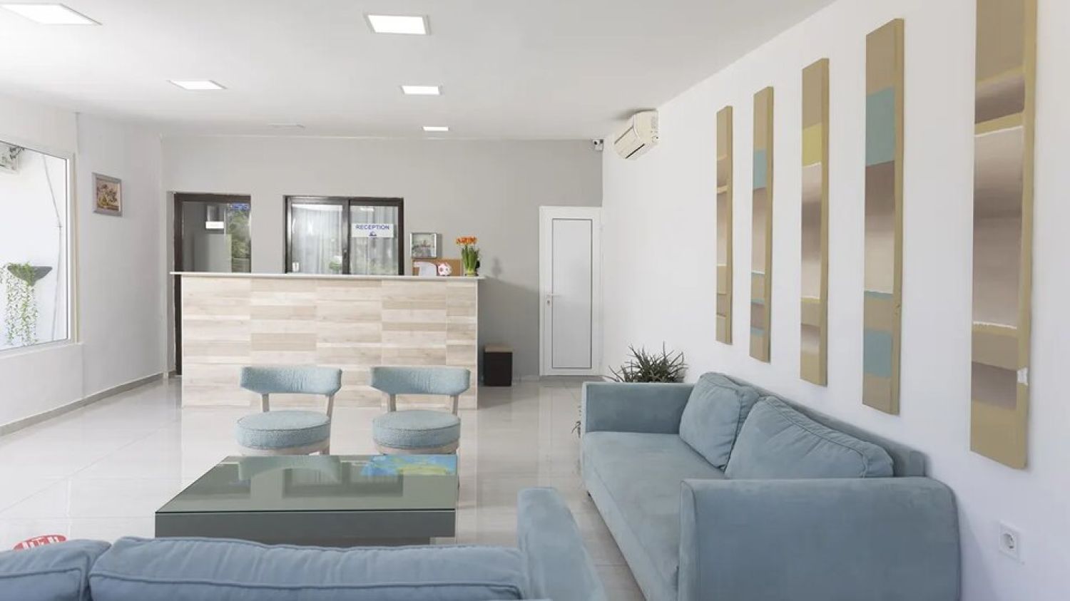 - Indoor common area: lobby with a small reception area