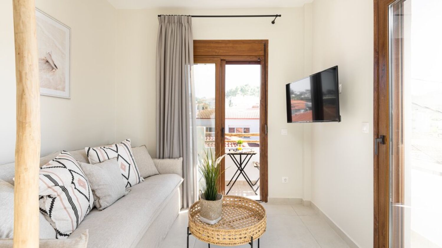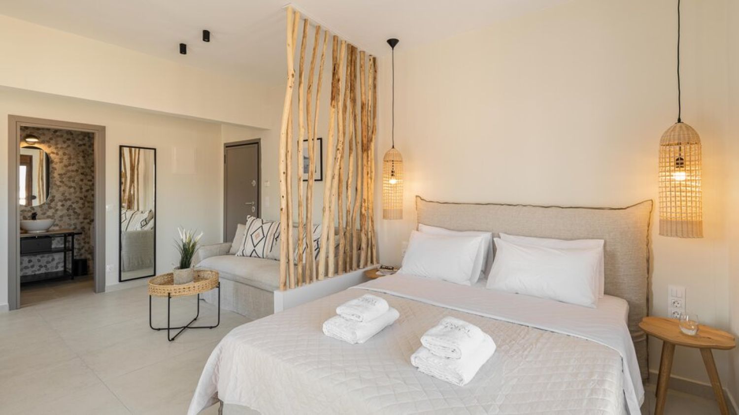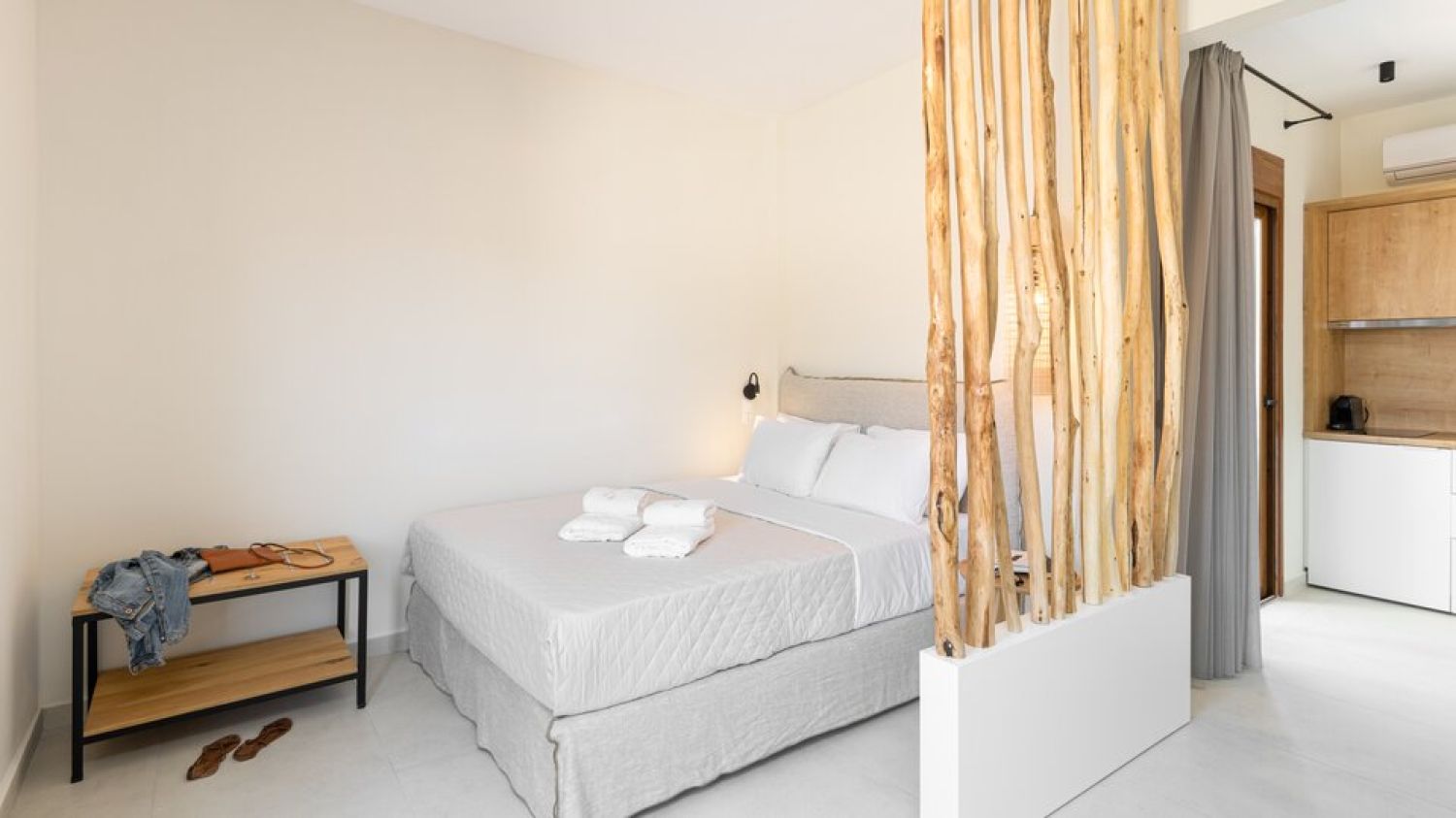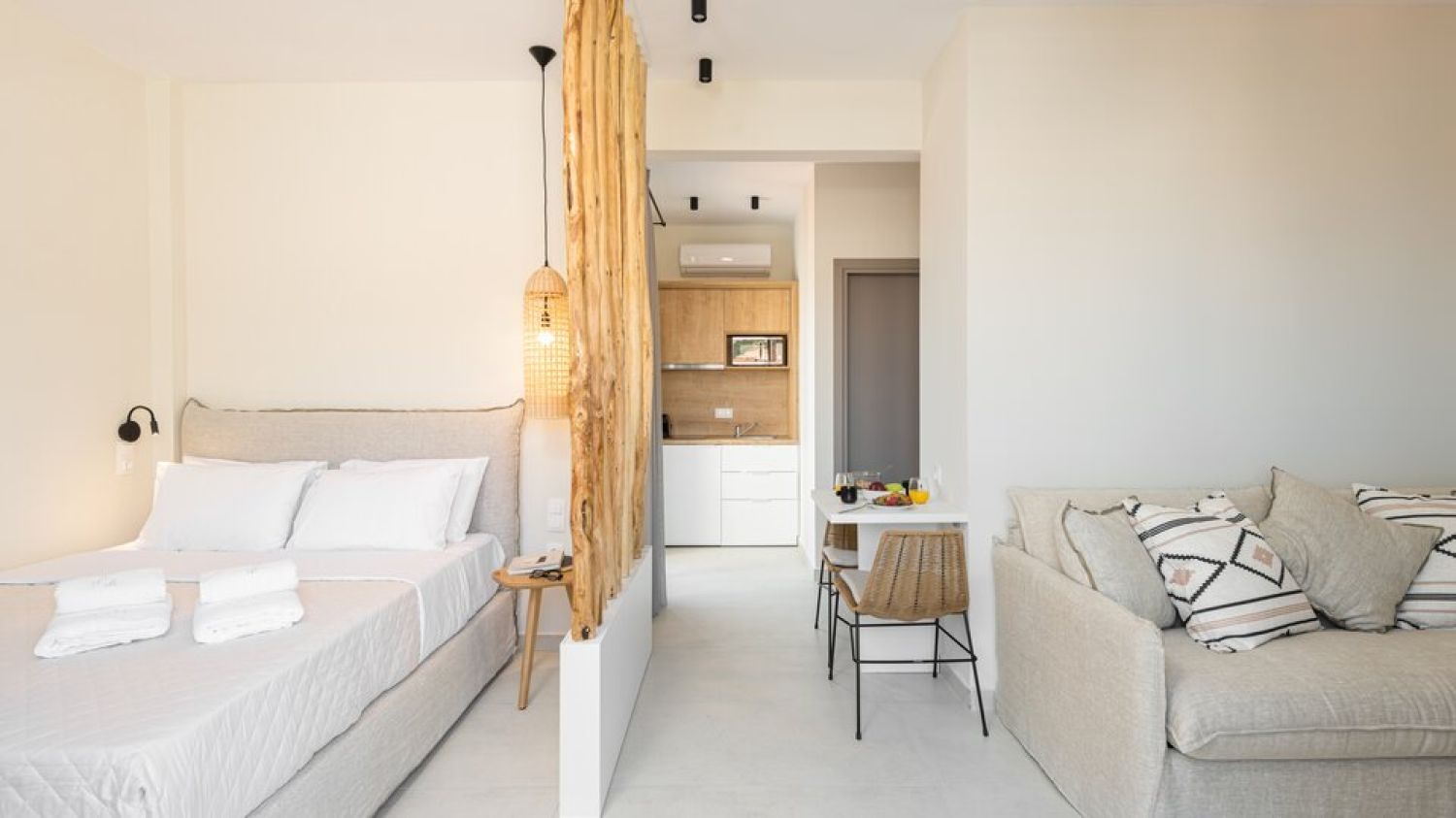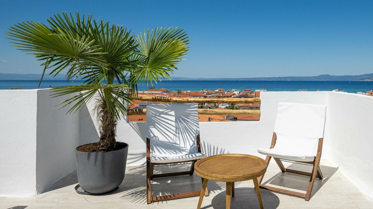 Indulge in sophisticated comfort at Boho Suites, a collection of premium suites ideally situated in the heart of old town of Pefkohori, Halkidiki. This haven caters to the discerning traveler seeking a blend of modern luxury and traditional Greek charm. Palm Suites blends the warmth of a traditional building with a complete modern refurbishment. Choose from 11 beautifully appointed suites, each boasting a private balcony or terrace and a convenient fully equipped kitchenette, featuring a modern ambiance with touches of bohemian flair. Step outside your suite and discover the vibrant village of Pefkohori at your doorstep.  Wander along the charming beach promenade lined with shops, cafes, bars, and delectable restaurants.  Immerse yourself in the lively atmosphere, which caters to all tastes, with local music venues, a luna park, and numerous beach bars. Explore the nearby Glarokavos beach, a stunning natural lagoon, perfect for swimming and sunbathing. Pefkohori's strategic location makes it an ideal base for exploring the greater Halkidiki region. Immerse yourself in the rich history and culture of the area, or venture further afield to discover Thessaloniki, Greece's vibrant second-largest city, located approximately one hour away.