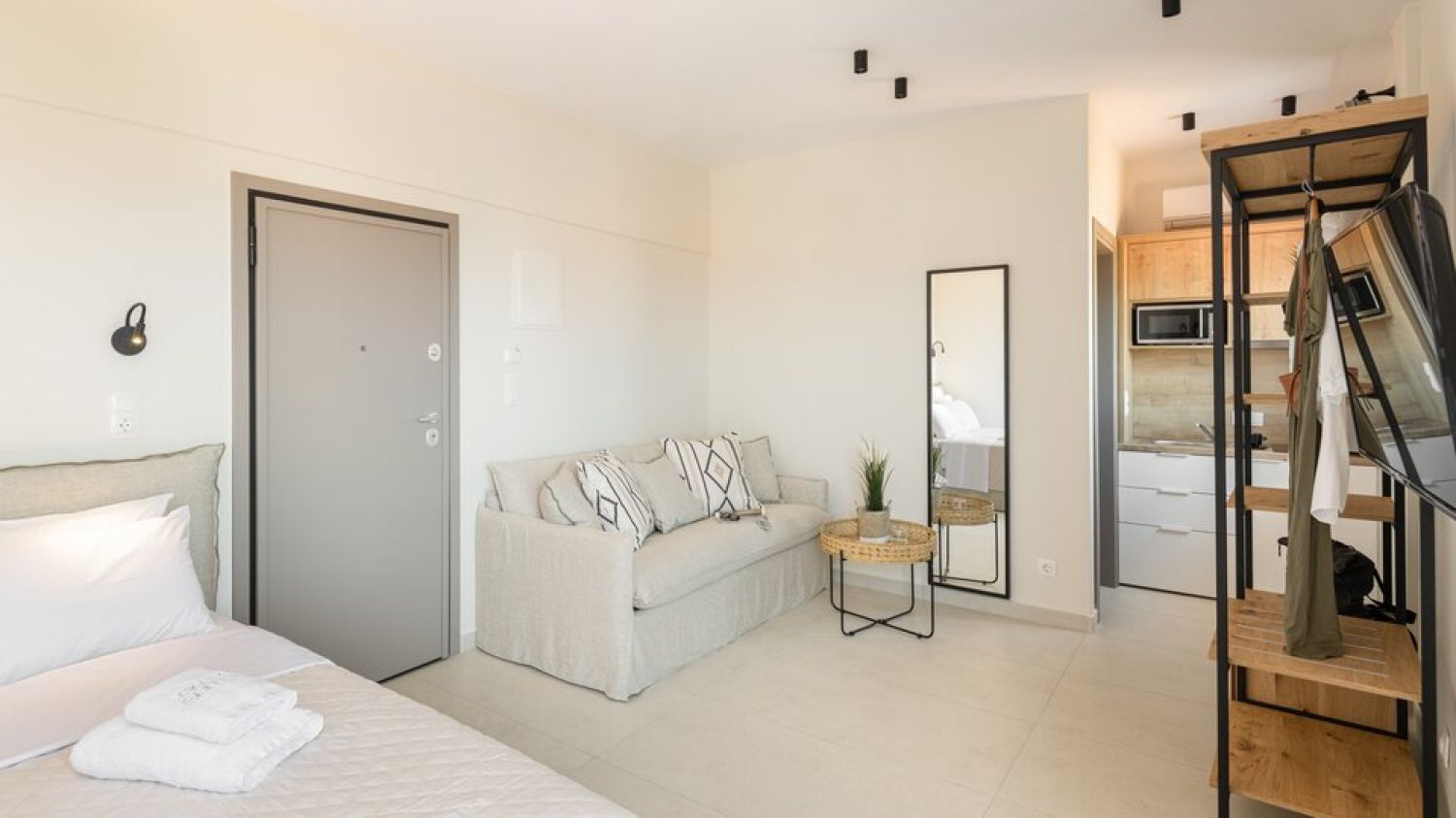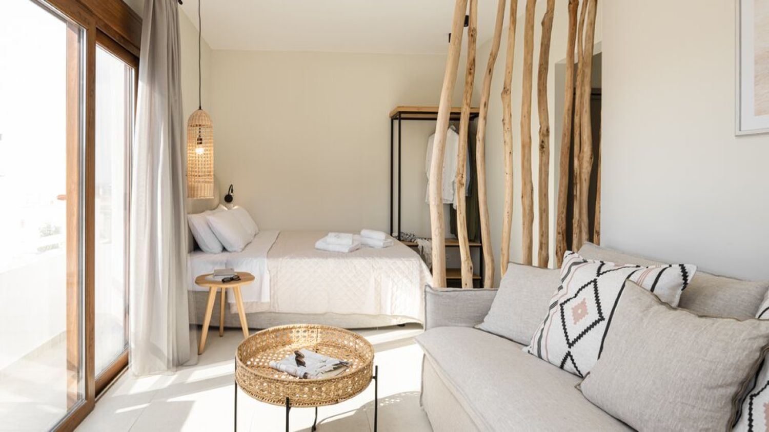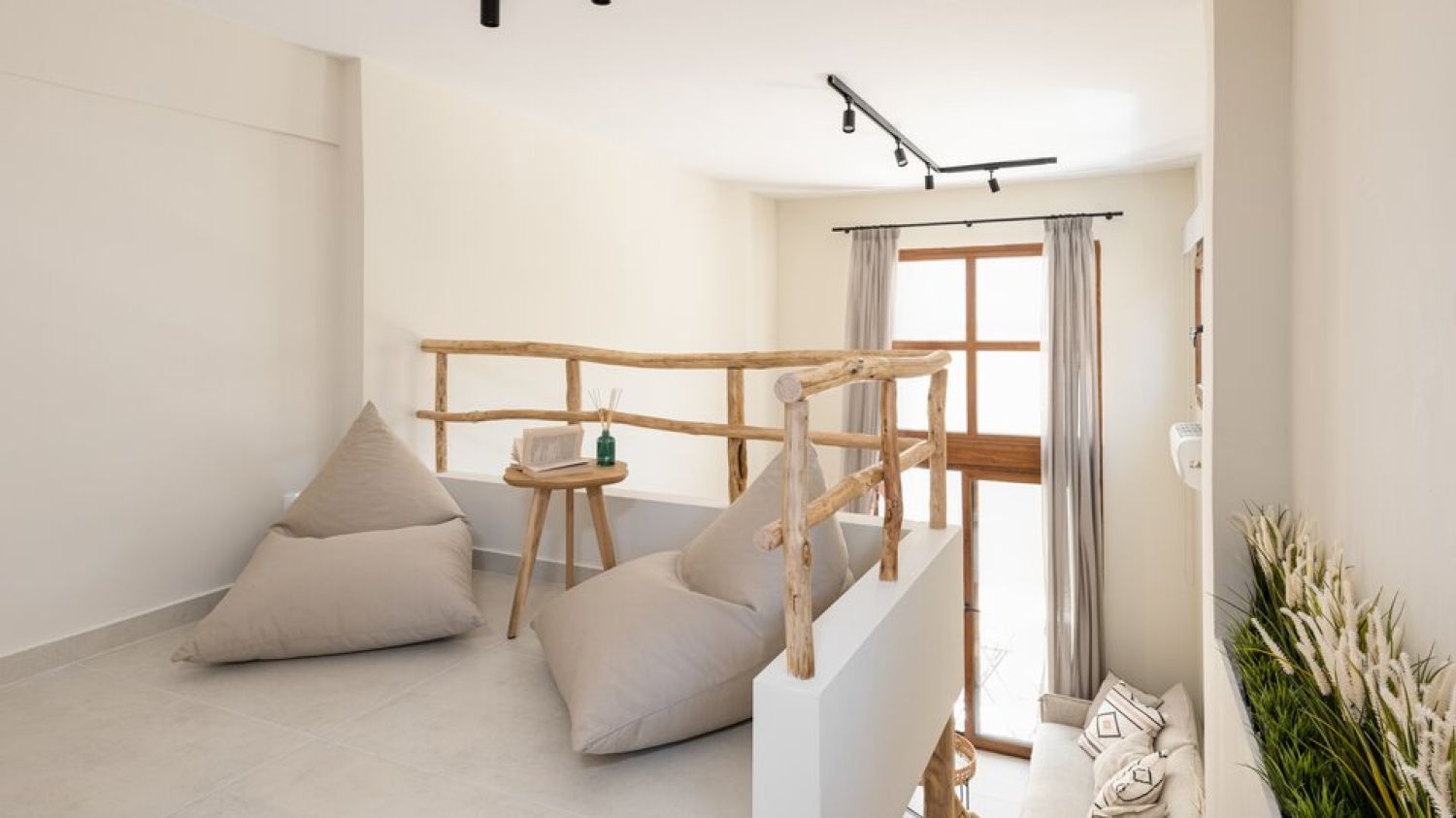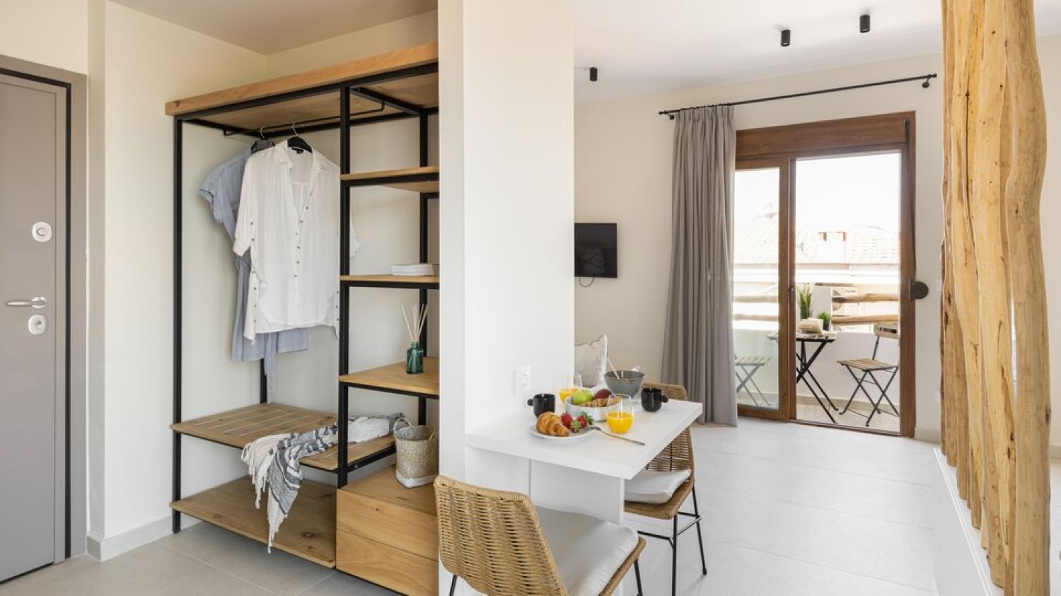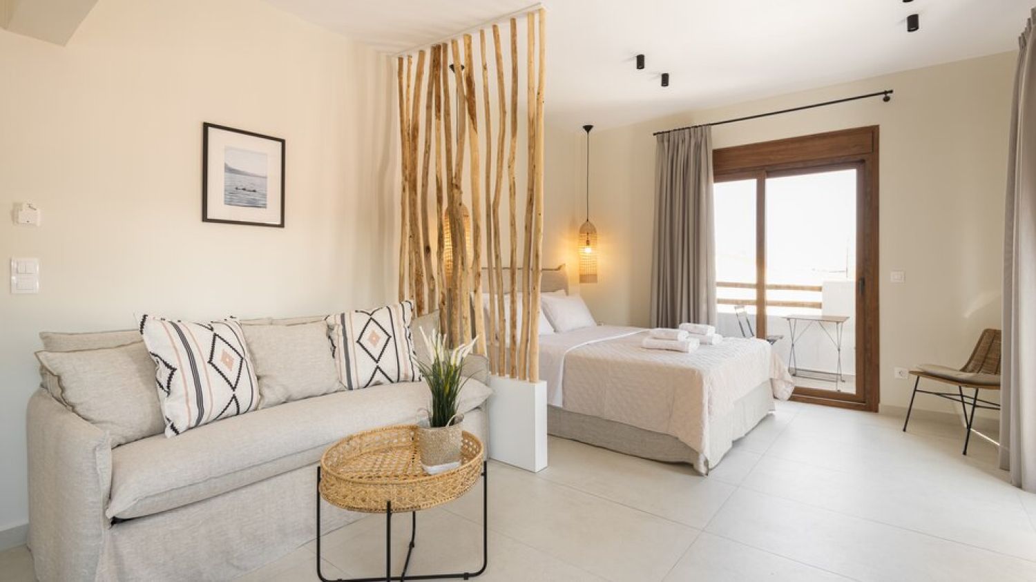 Indulge in sophisticated comfort at Boho Suites, a collection of premium suites ideally situated in the heart of old town of Pefkohori, Halkidiki. This haven caters to the discerning traveler seeking a blend of modern luxury and traditional Greek charm. Palm Suites blends the warmth of a traditional building with a complete modern refurbishment. Choose from 11 beautifully appointed suites, each boasting a private balcony or terrace and a convenient fully equipped kitchenette, featuring a modern ambiance with touches of bohemian flair. Step outside your suite and discover the vibrant village of Pefkohori at your doorstep.  Wander along the charming beach promenade lined with shops, cafes, bars, and delectable restaurants.  Immerse yourself in the lively atmosphere, which caters to all tastes, with local music venues, a luna park, and numerous beach bars. Explore the nearby Glarokavos beach, a stunning natural lagoon, perfect for swimming and sunbathing. Pefkohori's strategic location makes it an ideal base for exploring the greater Halkidiki region. Immerse yourself in the rich history and culture of the area, or venture further afield to discover Thessaloniki, Greece's vibrant second-largest city, located approximately one hour away.