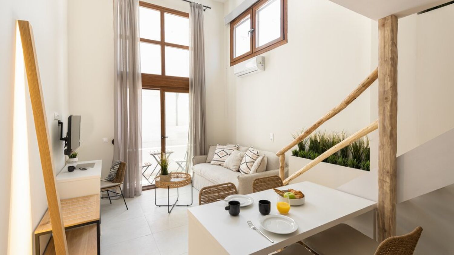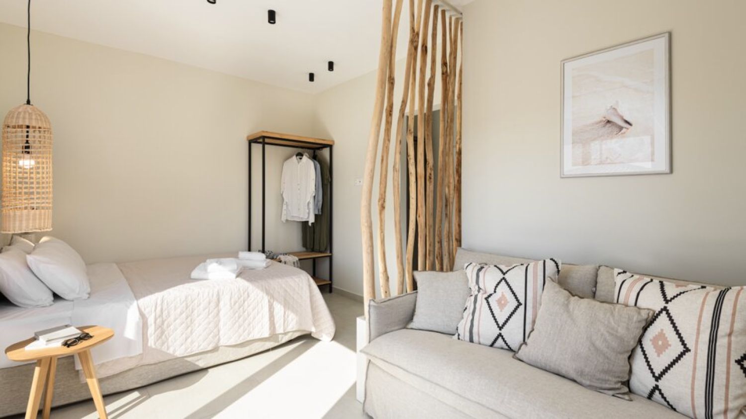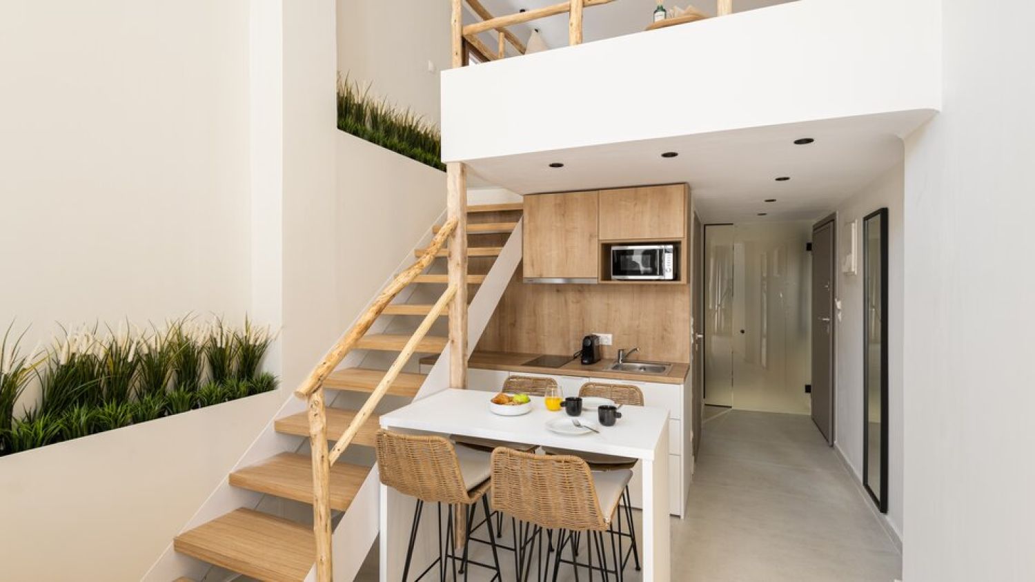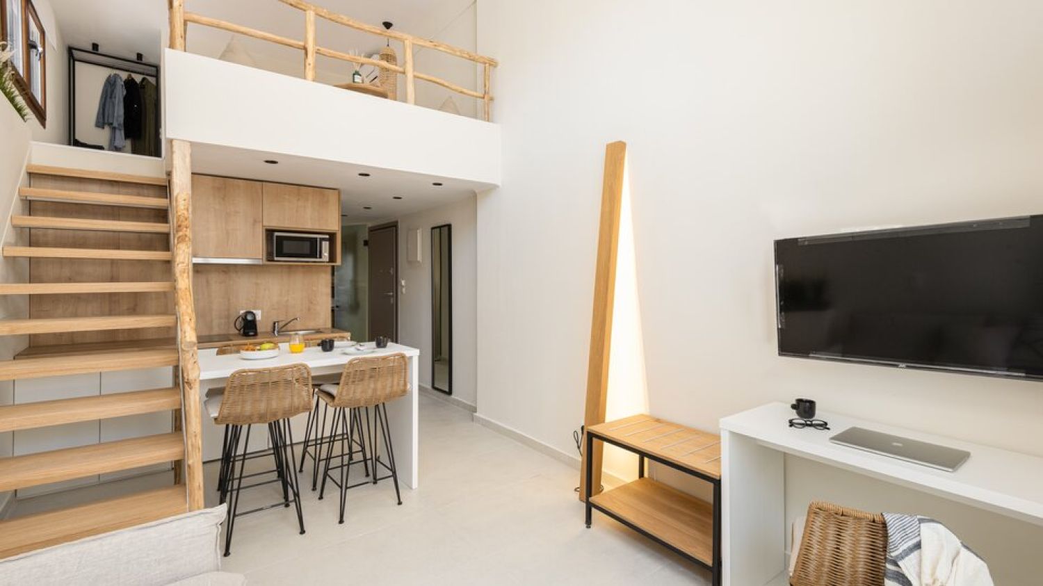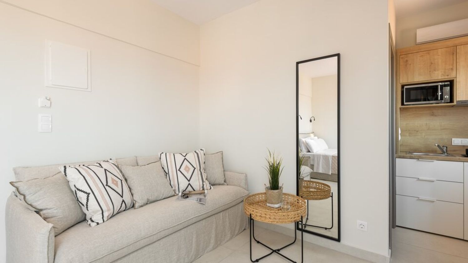 Indulge in sophisticated comfort at Boho Suites, a collection of premium suites ideally situated in the heart of old town of Pefkohori, Halkidiki. This haven caters to the discerning traveler seeking a blend of modern luxury and traditional Greek charm. Palm Suites blends the warmth of a traditional building with a complete modern refurbishment. Choose from 11 beautifully appointed suites, each boasting a private balcony or terrace and a convenient fully equipped kitchenette, featuring a modern ambiance with touches of bohemian flair. Step outside your suite and discover the vibrant village of Pefkohori at your doorstep.  Wander along the charming beach promenade lined with shops, cafes, bars, and delectable restaurants.  Immerse yourself in the lively atmosphere, which caters to all tastes, with local music venues, a luna park, and numerous beach bars. Explore the nearby Glarokavos beach, a stunning natural lagoon, perfect for swimming and sunbathing. Pefkohori's strategic location makes it an ideal base for exploring the greater Halkidiki region. Immerse yourself in the rich history and culture of the area, or venture further afield to discover Thessaloniki, Greece's vibrant second-largest city, located approximately one hour away.